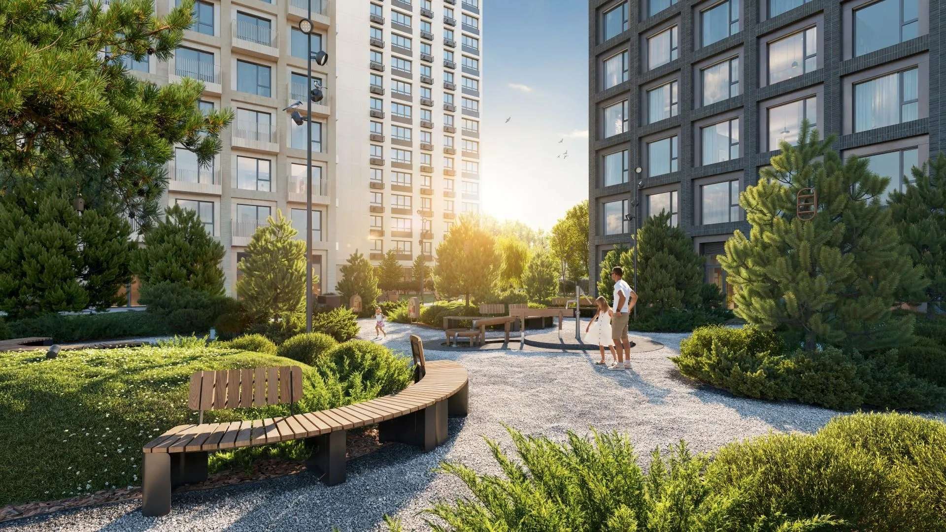 Здесь есть коворкинг с беседками и бесплатным Wi-Fi, зона для спокойного отдыха с шезлонгами и сенсорный сад. Для детей обустроены три площадки суммарной площадью почти 500 кв. м с уникальными элементами: переговорной трубой, водяными каналами и даже домиками для жуков. Спортивная зона оснащена брусьями, рукоходами и всесезонным теннисным столом. Треть участка отдана под озеленение с крупномерными деревьями и хвойными растениями.