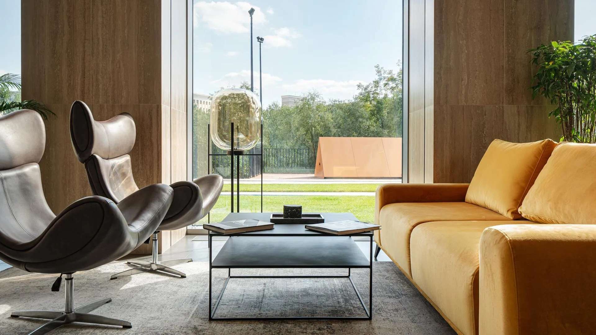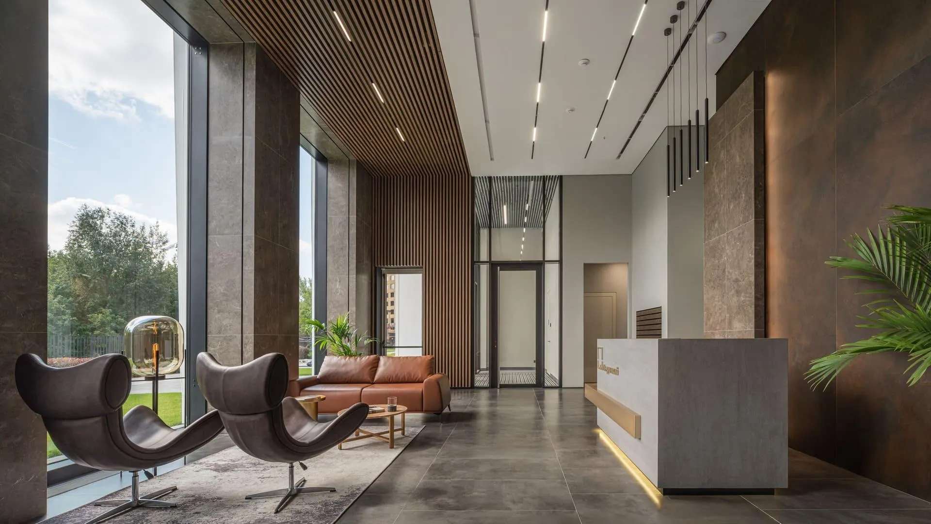 Площадь входных групп варьируется от 90 до 128 кв. м, а высота потолков достигает 4,5 метров, что создает ощущение воздуха и света в сочетании с панорамным остеклением. Дизайн интерьеров вдохновлен природными мотивами: используются материалы с текстурами мрамора, травертина, деревянные ламели на стенах и потолке, а также акцентные металлические элементы, имитирующие рябь на воде.