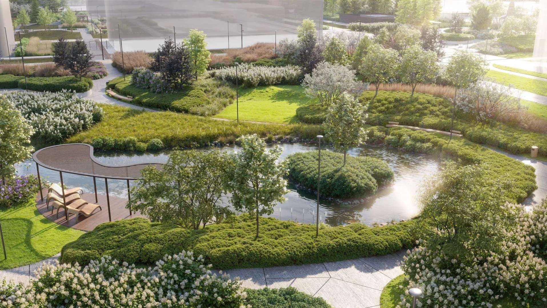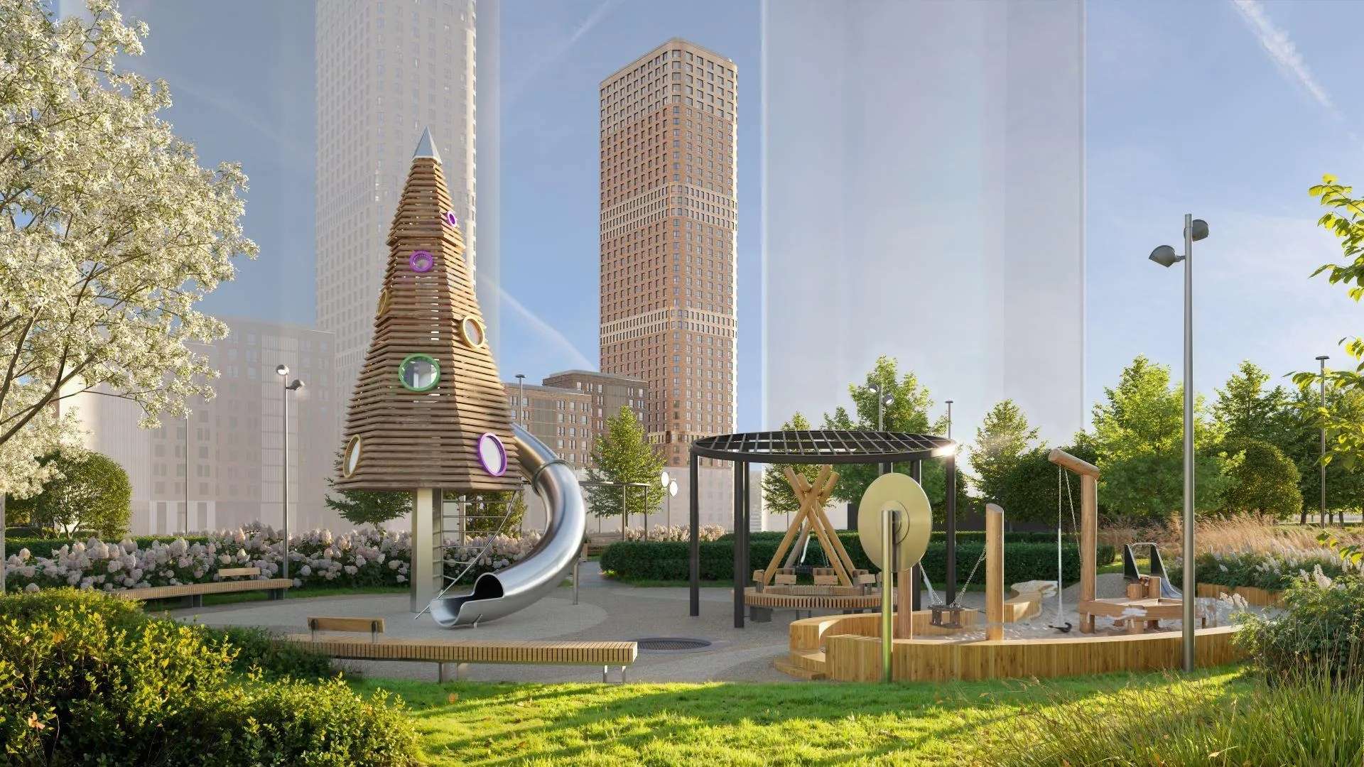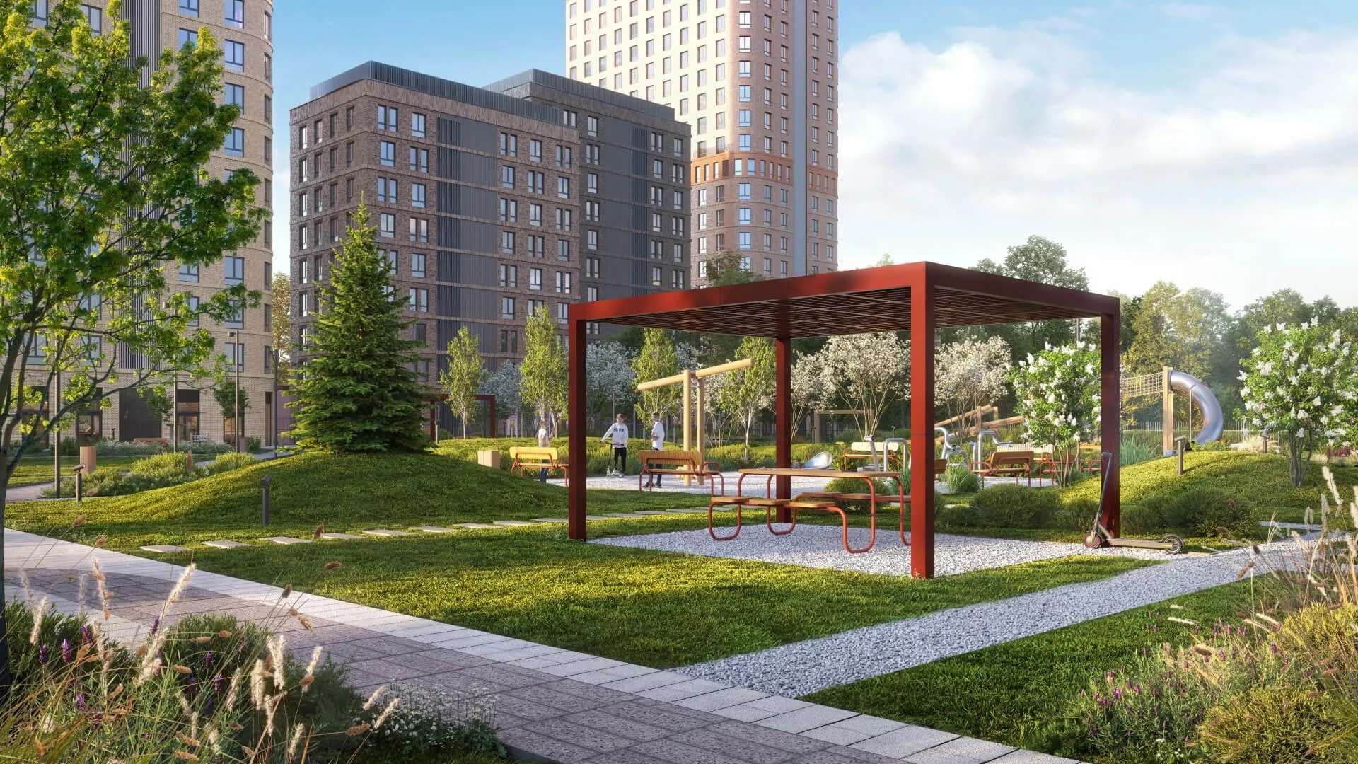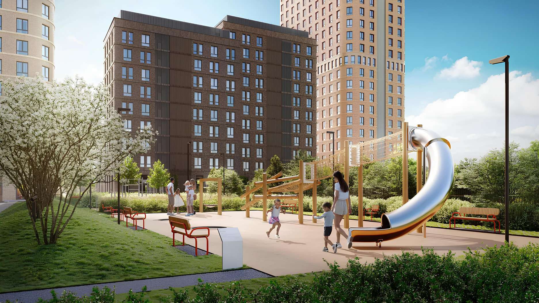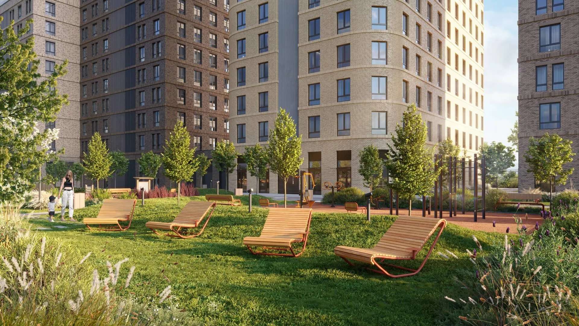 Планируется обустроить несколько детских площадок с безопасным покрытием. Для любителей спокойного отдыха предусмотрены эко-тропы для прогулок и сенсорный сад.