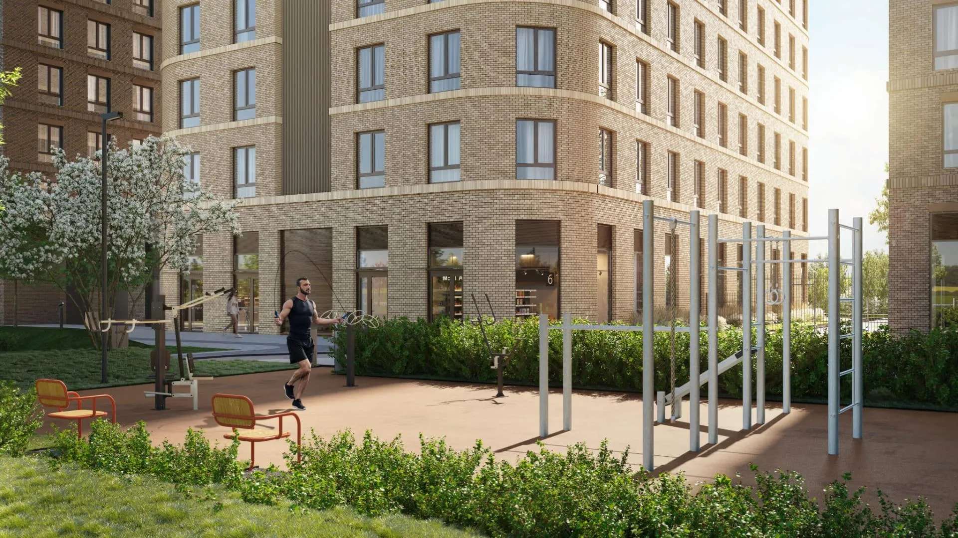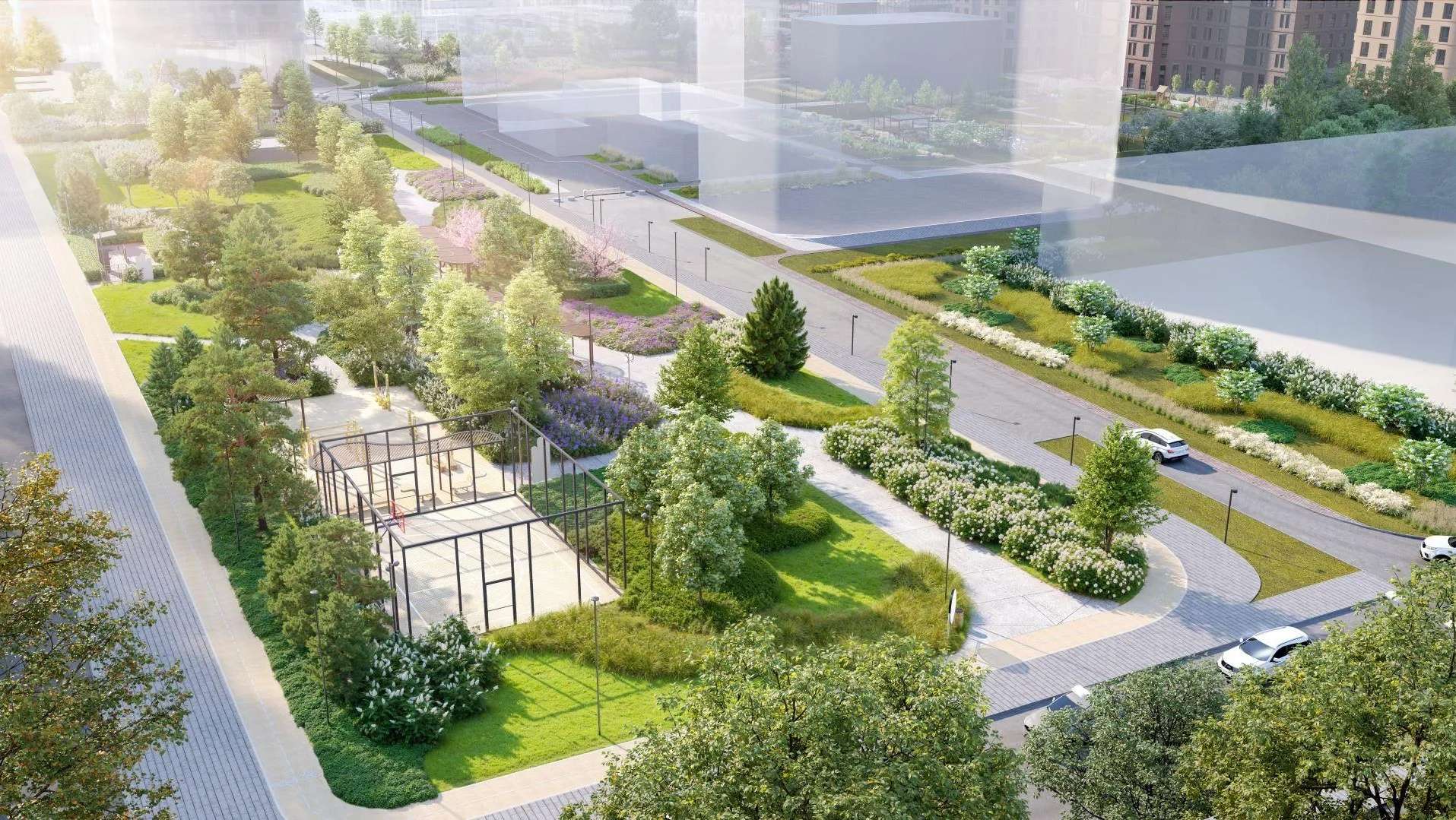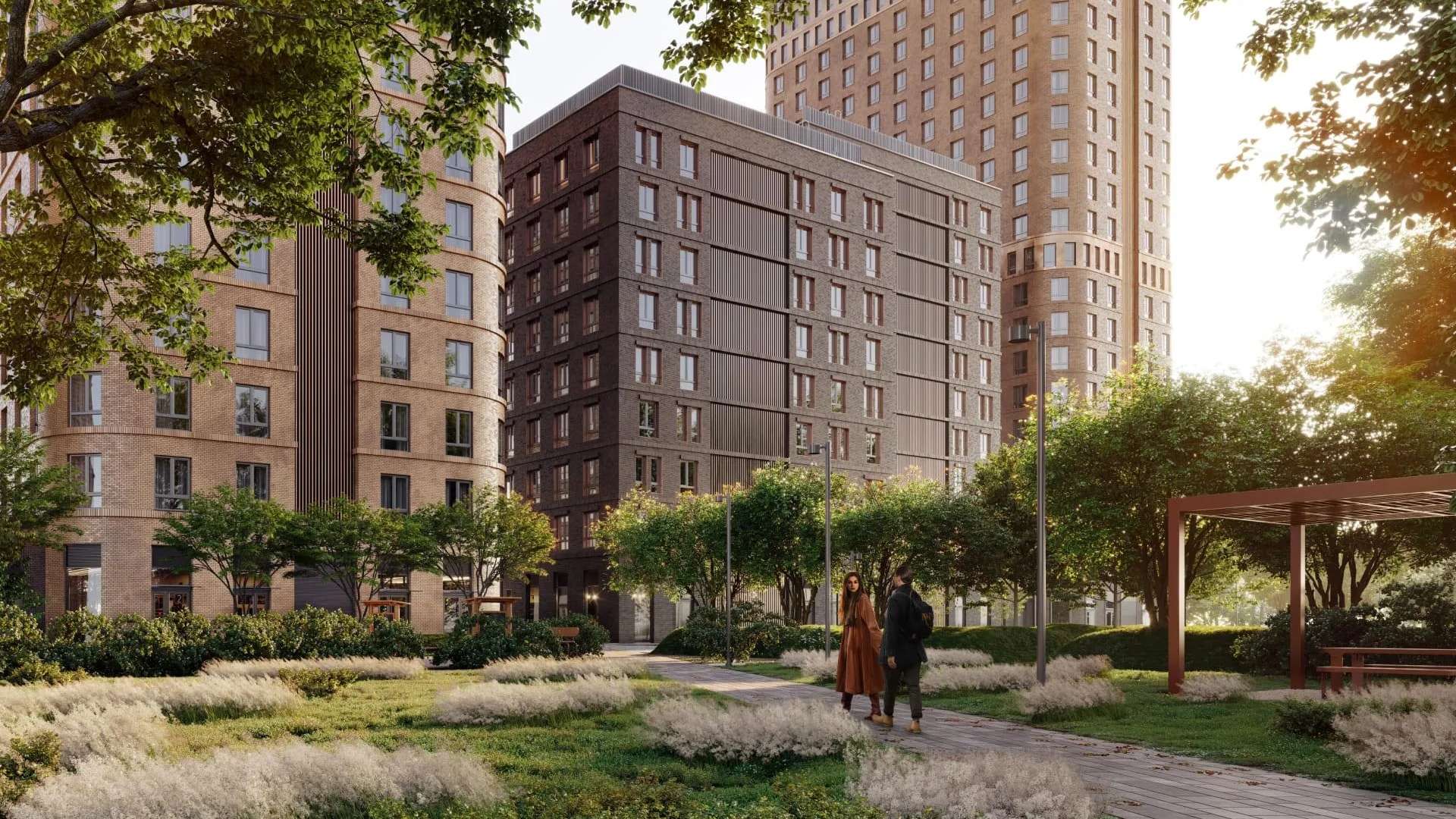 Концепция двора полностью исключает присутствие автомобилей: это приватная зона, предназначенная исключительно для жителей. Здесь не будет посторонних, а для резидентов создадут все условия для отдыха и активного времяпрепровождения.