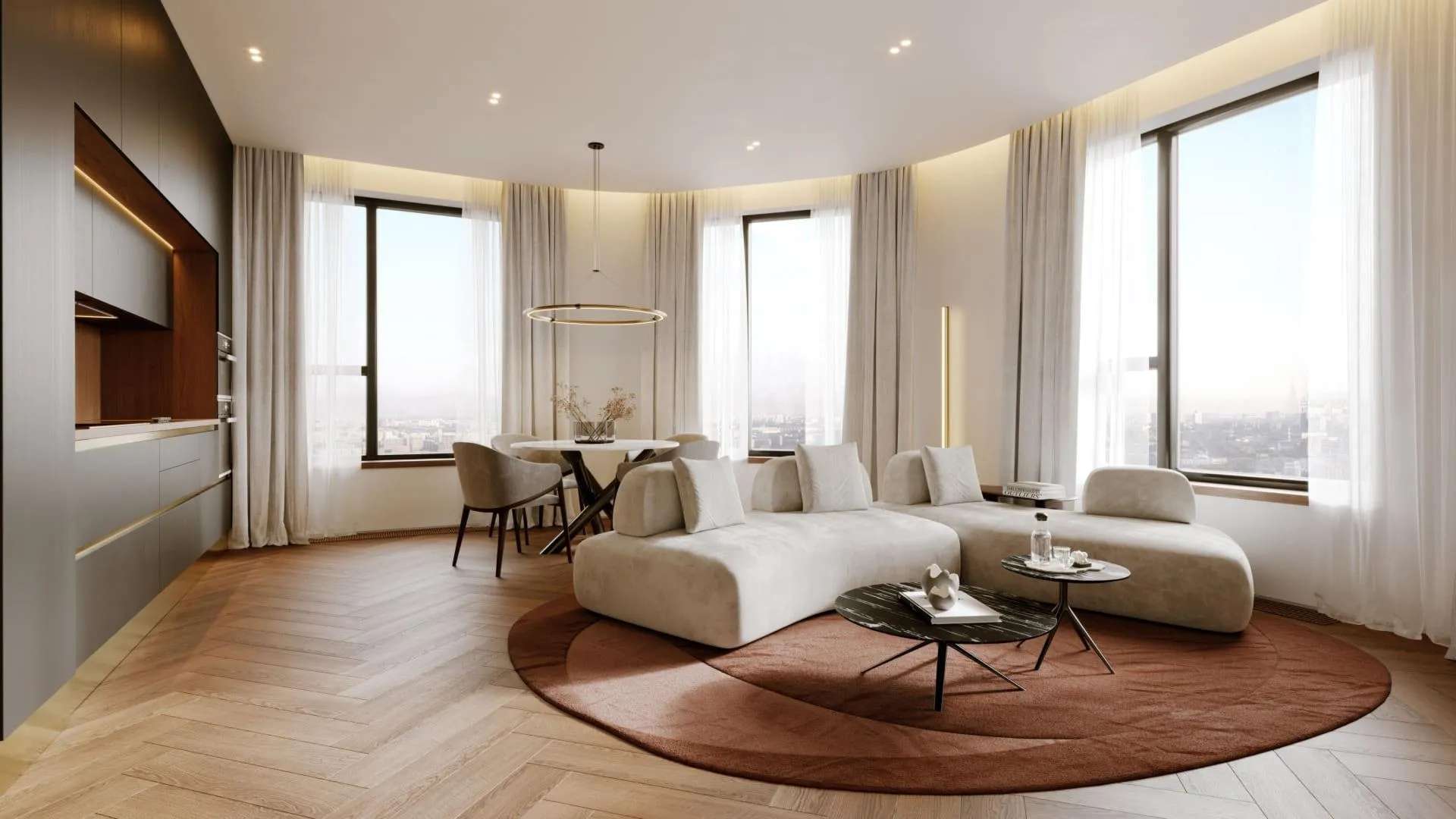 Во всех квартирах предусмотрены увеличенные, а зачастую и панорамные окна, которые наполняют пространство светом и делают интерьер визуально легче. Высота потолков составляет 2,85 м, что создает ощущение простора даже в компактных студиях.