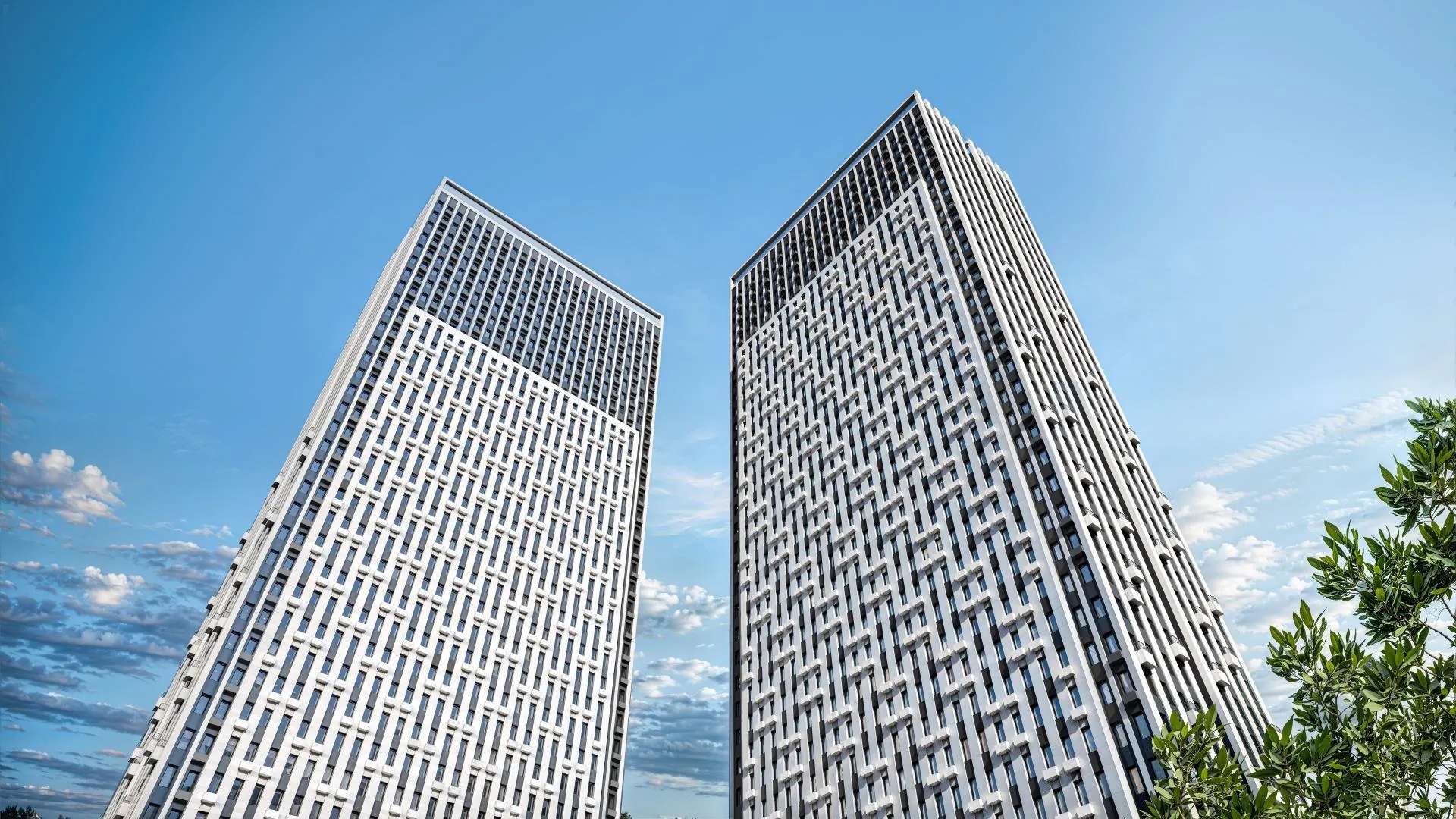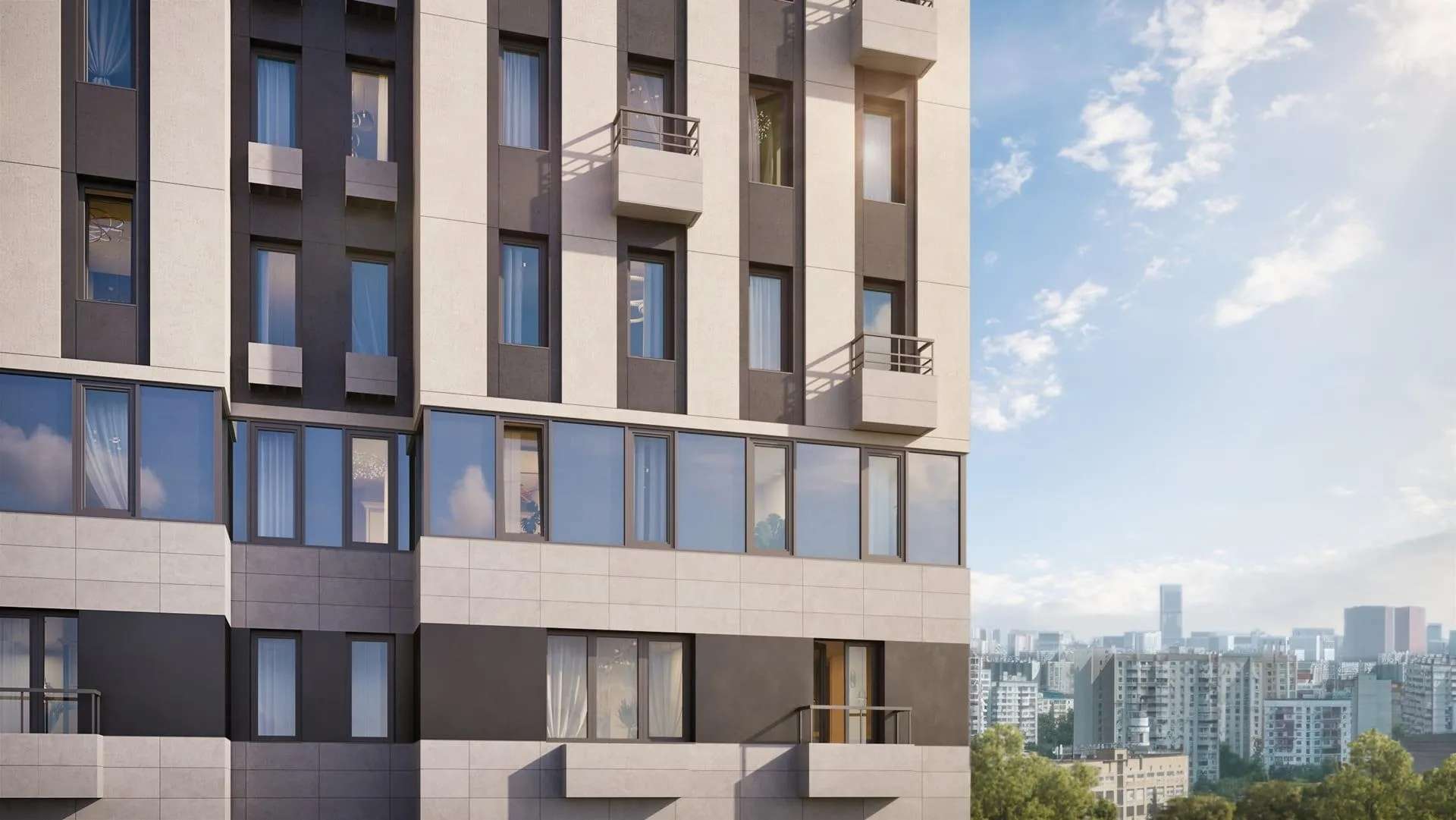 В отделке фасадов использовано контрастное сочетание материалов: крупноформатный керамогранит, фиброцементные панели и алюминиевые кассеты в природных оттенках от молочно-белого до темно-коричневого. Такое решение позволяет визуально облегчить массивные башни и интегрировать их в окружающую застройку.