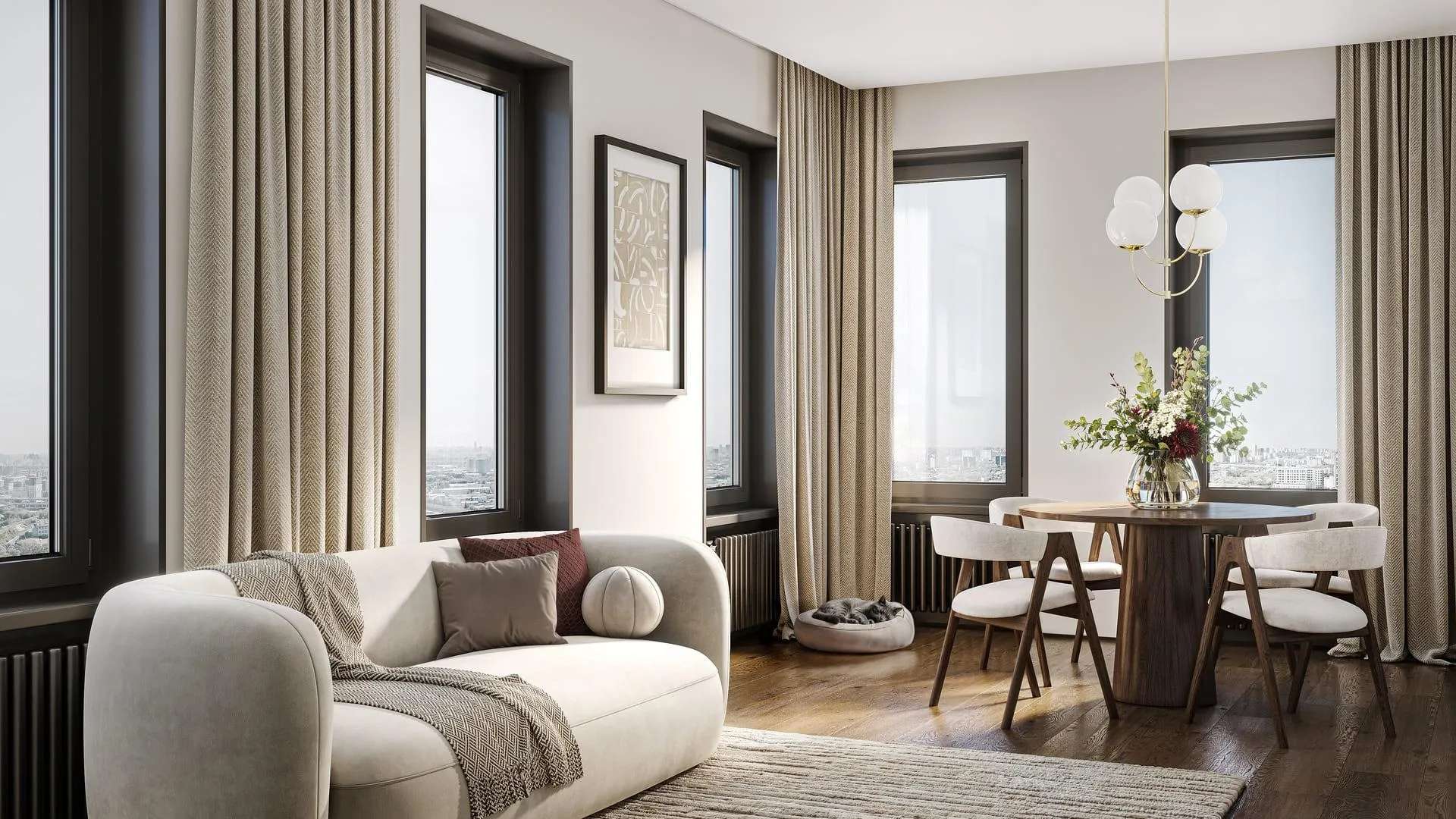Площадь квартир варьируется от компактных студий до просторных семейных квартир. Высота потолков достигает 2,72–2,8 м, а оконные проемы увеличены до 1,76 м, что обеспечивает отличную инсоляцию. Квартиры продаются без отделки, что дает возможность создать интерьер по своему вкусу.