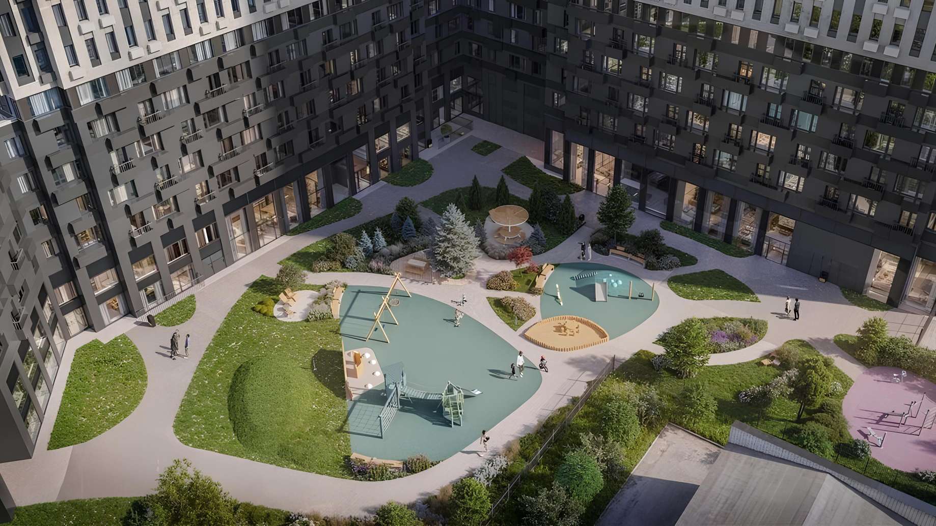 Придомовая территория общей площадью более гектара будет полностью закрыта от посторонних и благоустроена. Ландшафт продуман до мелочей: его композиция одинаково выигрышно смотрится как с земли, так и в перспективе с верхних этажей.