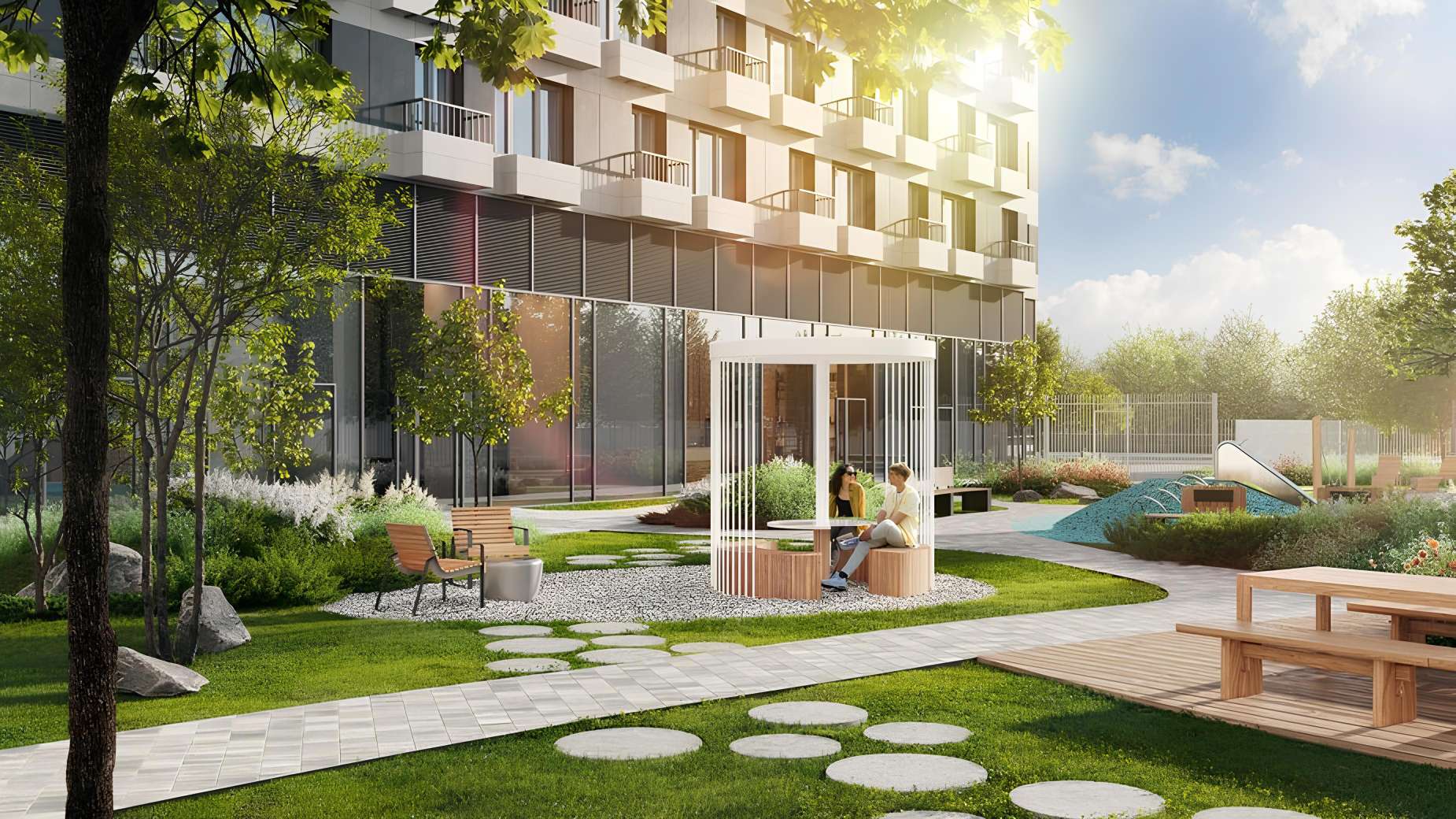 Ландшафтные дизайнеры подобрали растения так, чтобы двор оставался ярким с ранней весны до поздней осени, а сенсорный сад станет местом для тихих прогулок и отдыха.