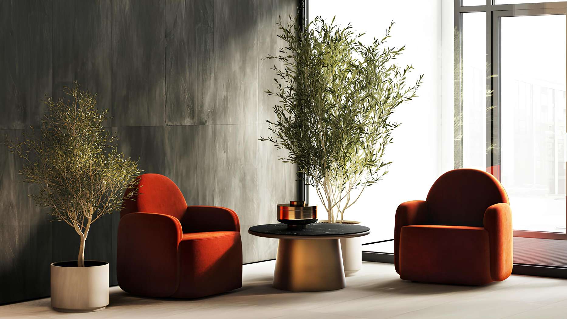 Просторные лобби площадью до 86 квадратных метров имеют высоту потолков от 4,3 до почти 5 метров, что создает ощущение воздуха и простора. В отделке применен крупноформатный керамогранит теплых охристых оттенков. Эффектными акцентами служат детали под латунь и стильная мебель, включая терракотовые кресла в зоне ожидания.