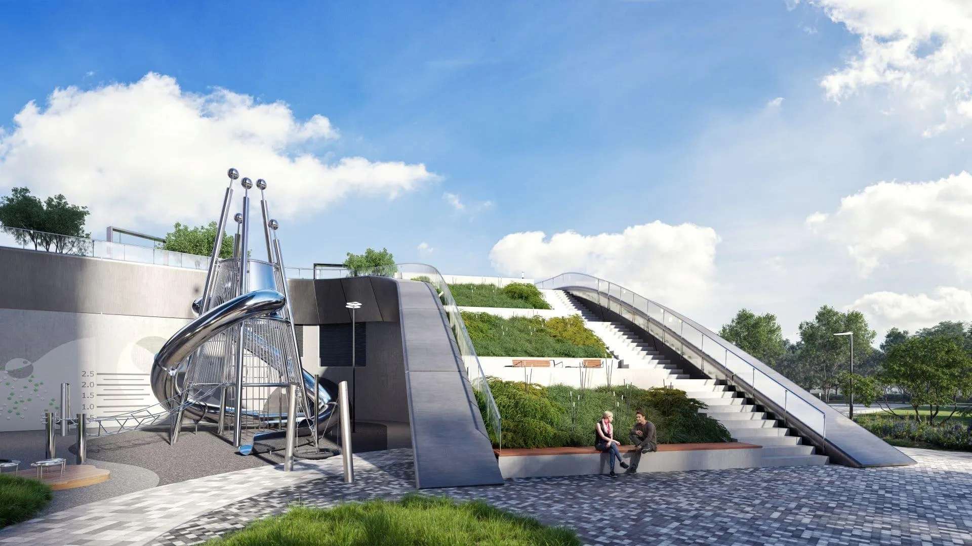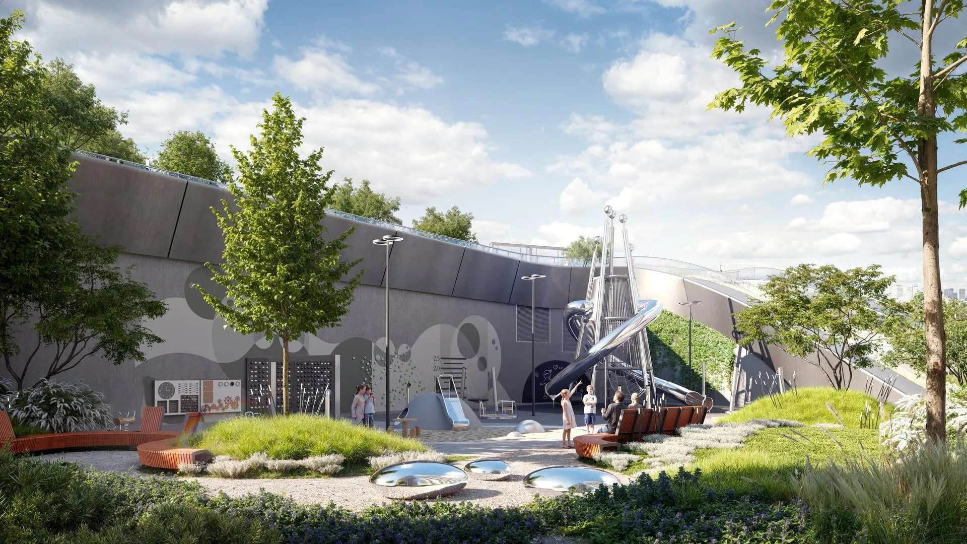 Пространство зонировано на функциональные «облака»: здесь есть «облако спокойствия» для тихого отдыха, детская площадка для игр и воркаут-зона для занятий спортом.