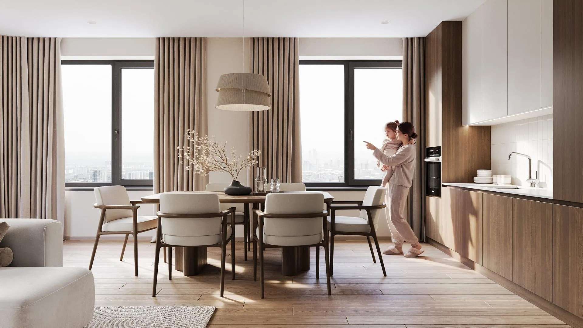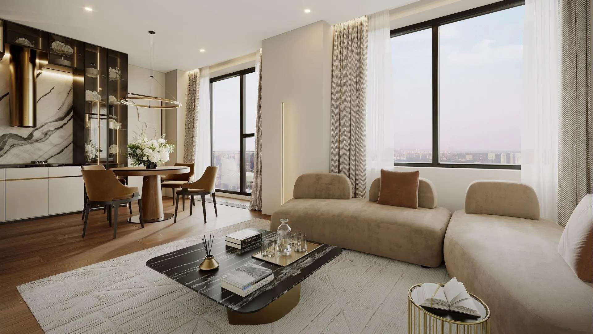 Во многих квартирах продуманы эргономичные пространства: гардеробные, ниши для хранения, мастер-спальни с собственным санузлом, а высота потолков в некоторых лотах достигает 3,5 метра, создавая ощущение простора и воздуха.