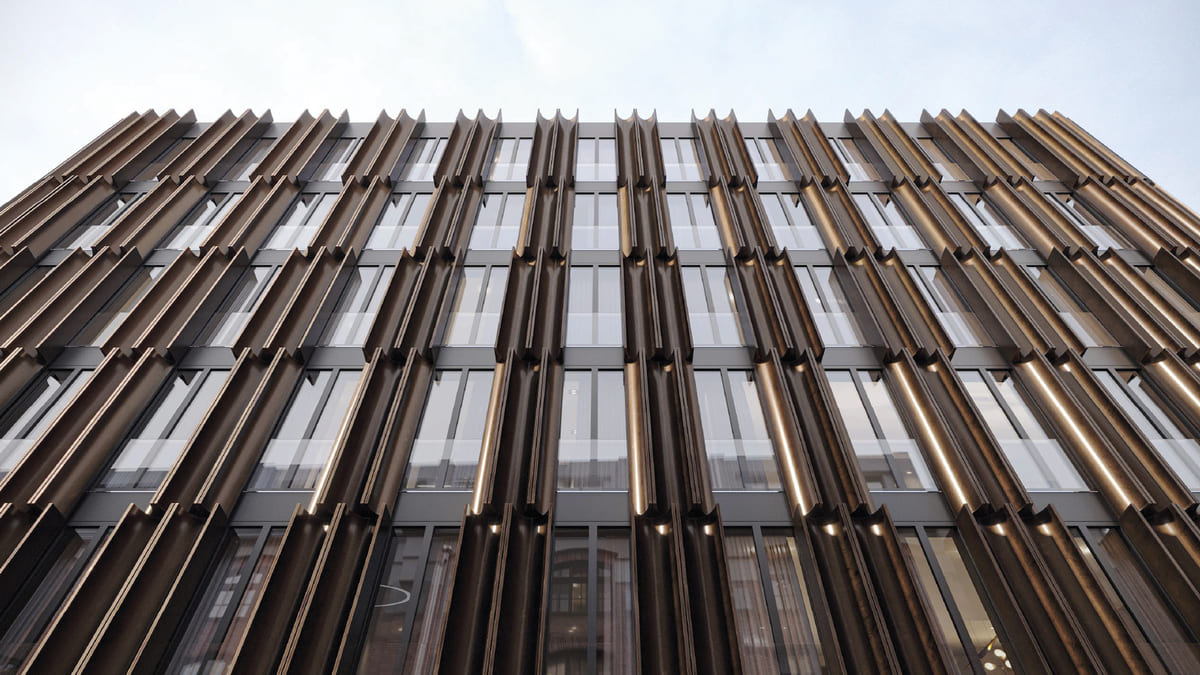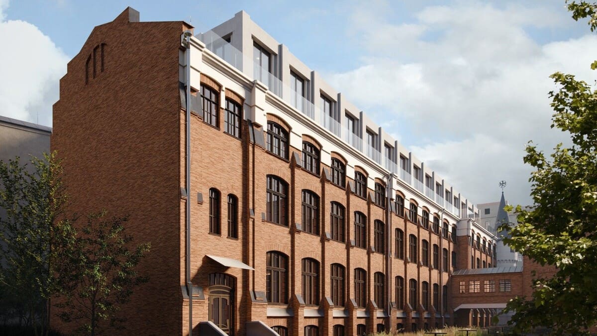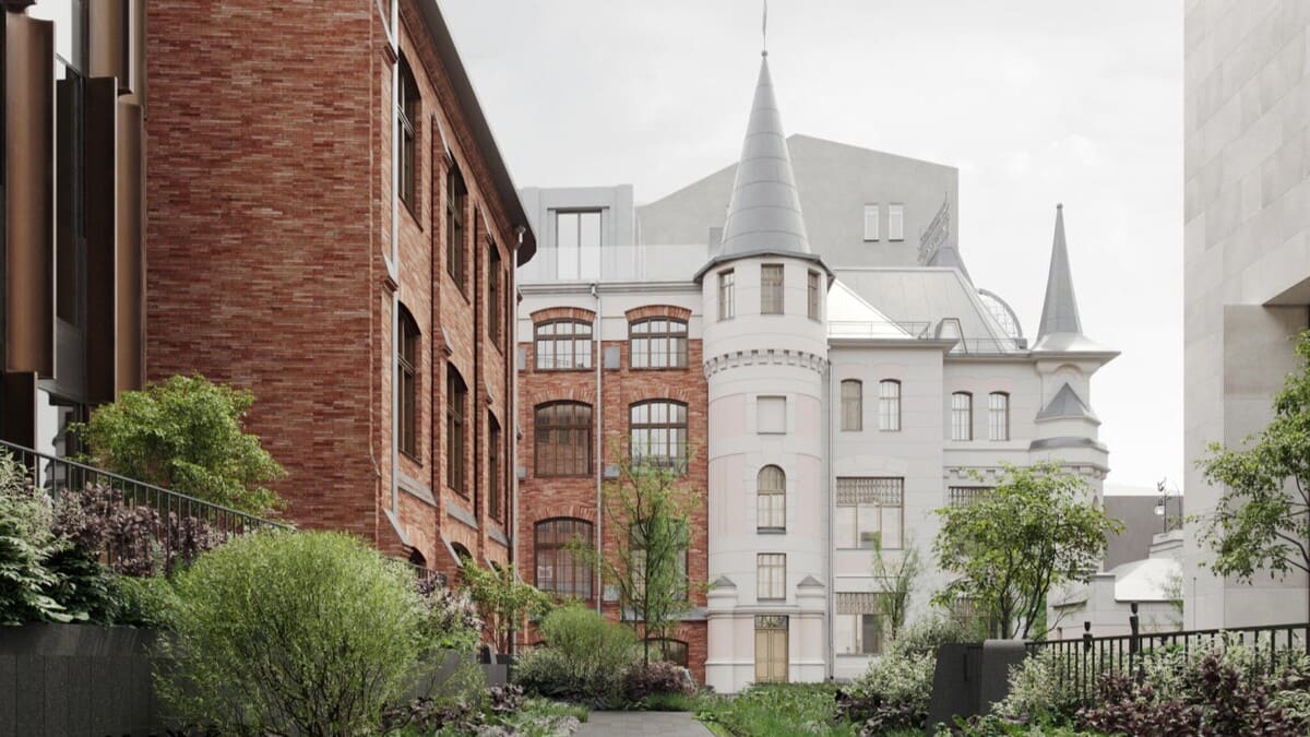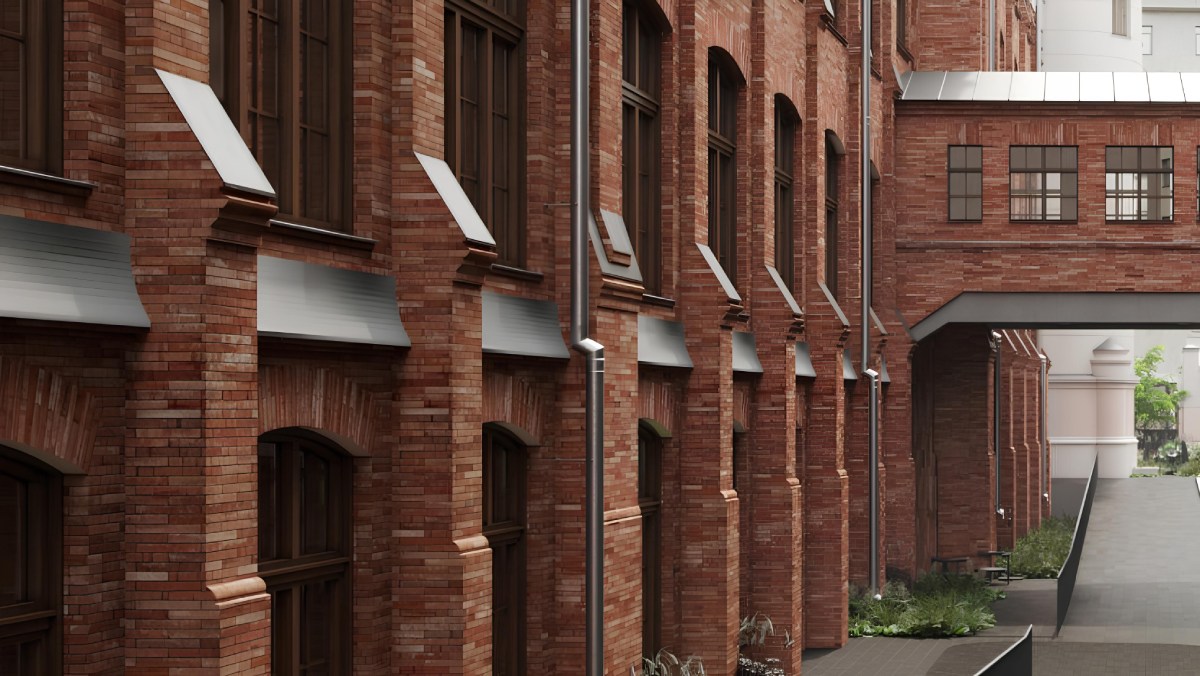 Новые корпуса комплекса выполнены в актуальной архитектурной стилистике, где стекло и бронза фасадов изящно подчеркивают историческую составляющую проекта и создают атмосферу диалога времён.