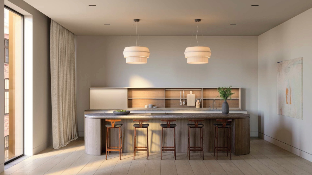 В отделке использованы лучшие натуральные материалы: мрамор благородных оттенков, редкие породы дерева, бронзовые детали ручной работы.