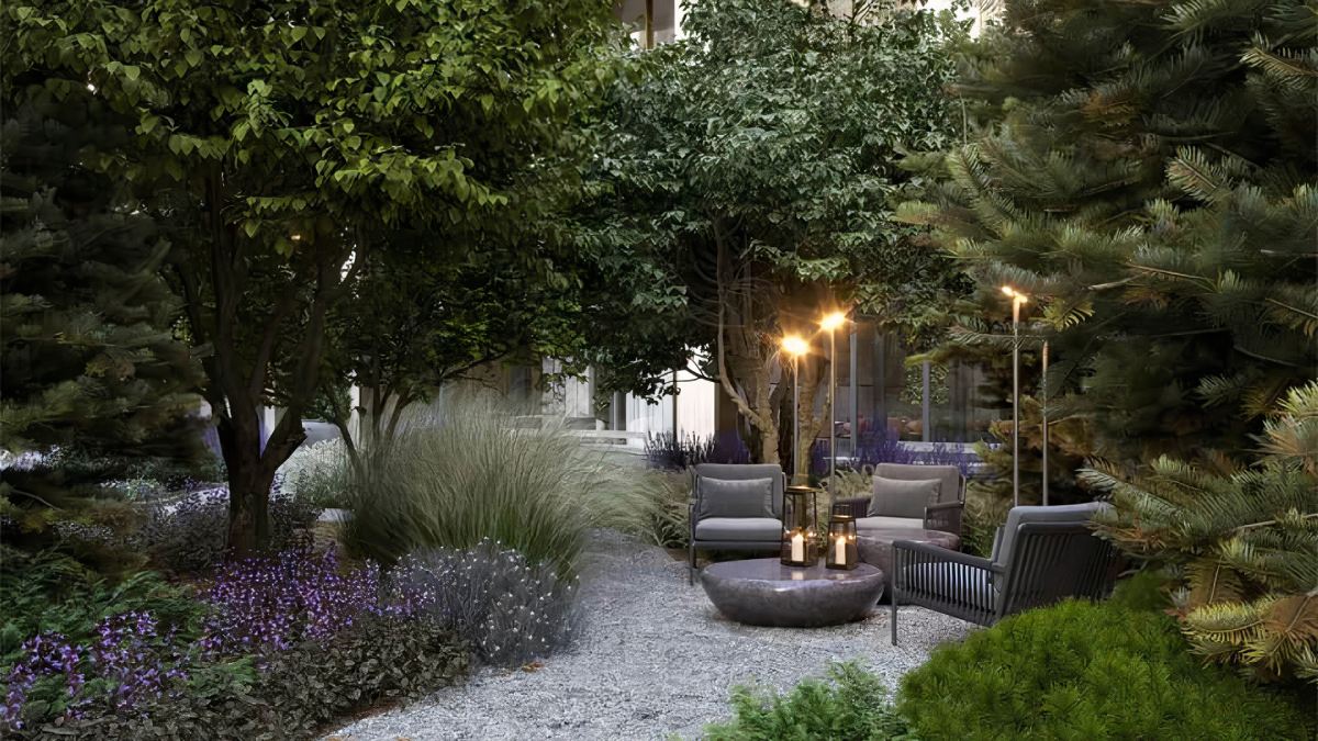 Пешеходные дорожки выполнены с подогревом, что особенно удобно в зимнее время. Центром притяжения становится lounge-зона под клёном, обрамлённая дизайнерской мебелью и мягкими сценариями освещения.