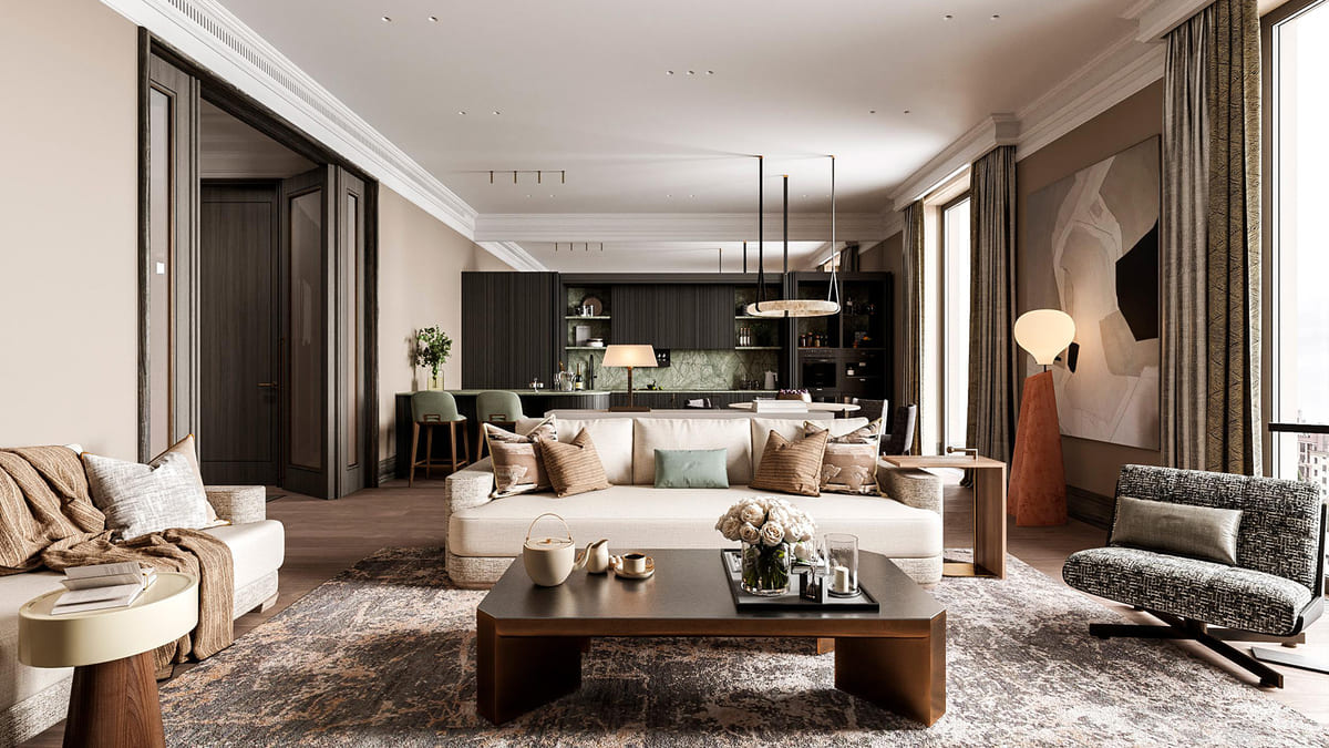 Особое внимание заслуживают три пентхауса от 348 до 706 м². Центральный гранд-пентхаус занимает весь этаж и предлагает уникальную планировку с четырьмя мастер-спальнями, двумя кухнями-гостиными, баром, спортзалом, детской игровой комнатой, помещением для персонала и просторной террасой.