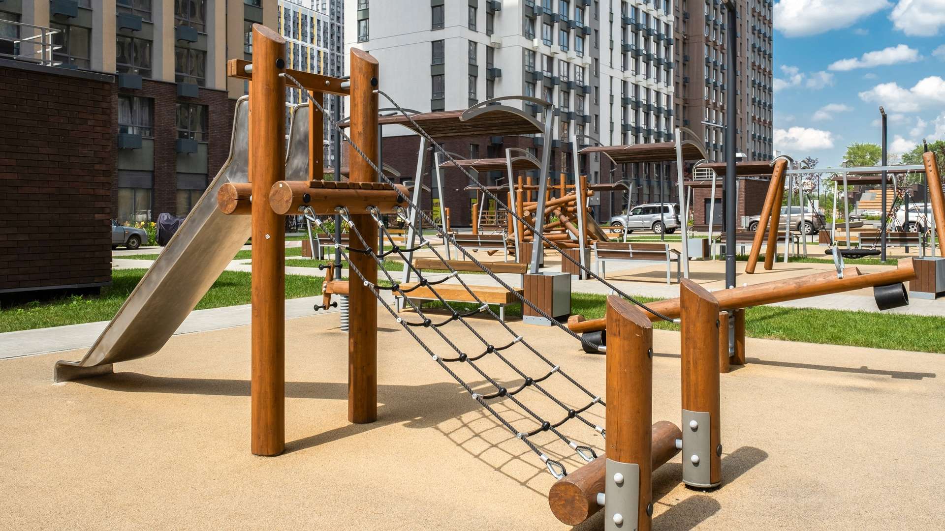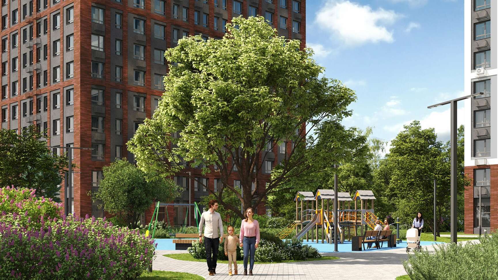 Территория комплекса представляет собой единое благоустроенное пространство площадью 2,7 гектара. Во дворах созданы разнообразные зоны для отдыха и активного времяпрепровождения. Детские площадки оборудованы современными игровыми комплексами с безопасным покрытием.