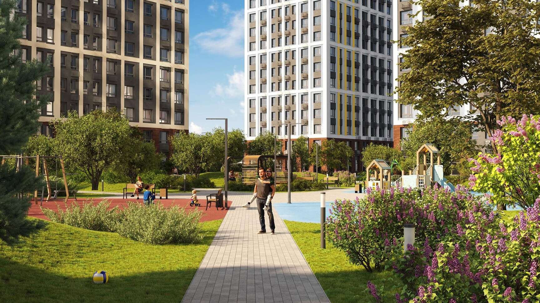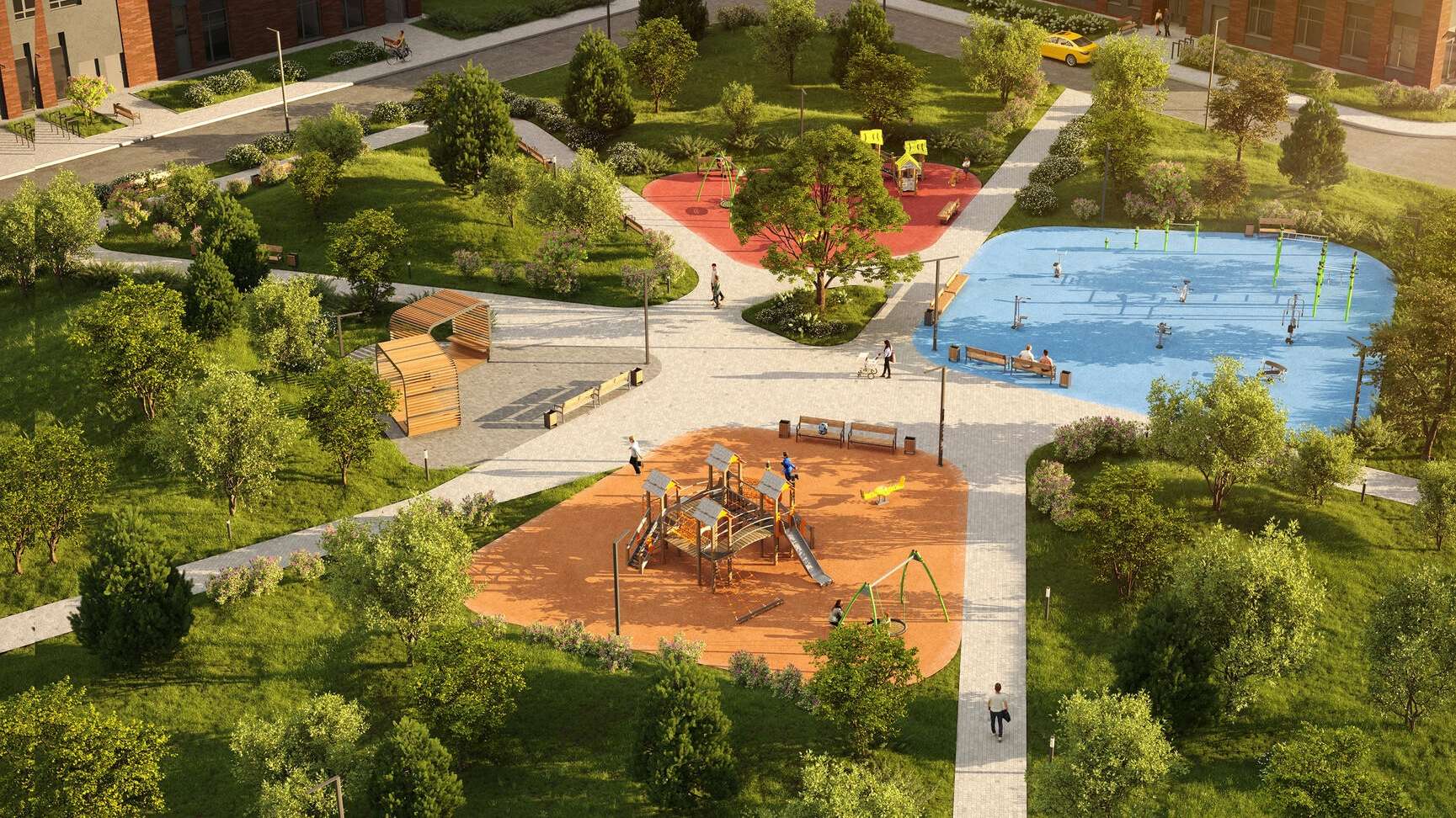 Спортивные зоны включают тренажеры для воркаута, столы для настольного тенниса и площадки для мини-футбола. Ландшафтный дизайн дополнен малыми архитектурными формами и зелеными газонами с декоративными кустарниками.