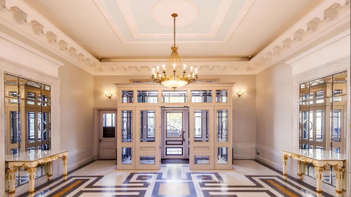 Входные группы комплекса выполнены в атмосферном дворцовом стиле. Интерьеры оформлены с использованием качественных материалов и декоративных элементов, подчеркивающих исторический характер здания.