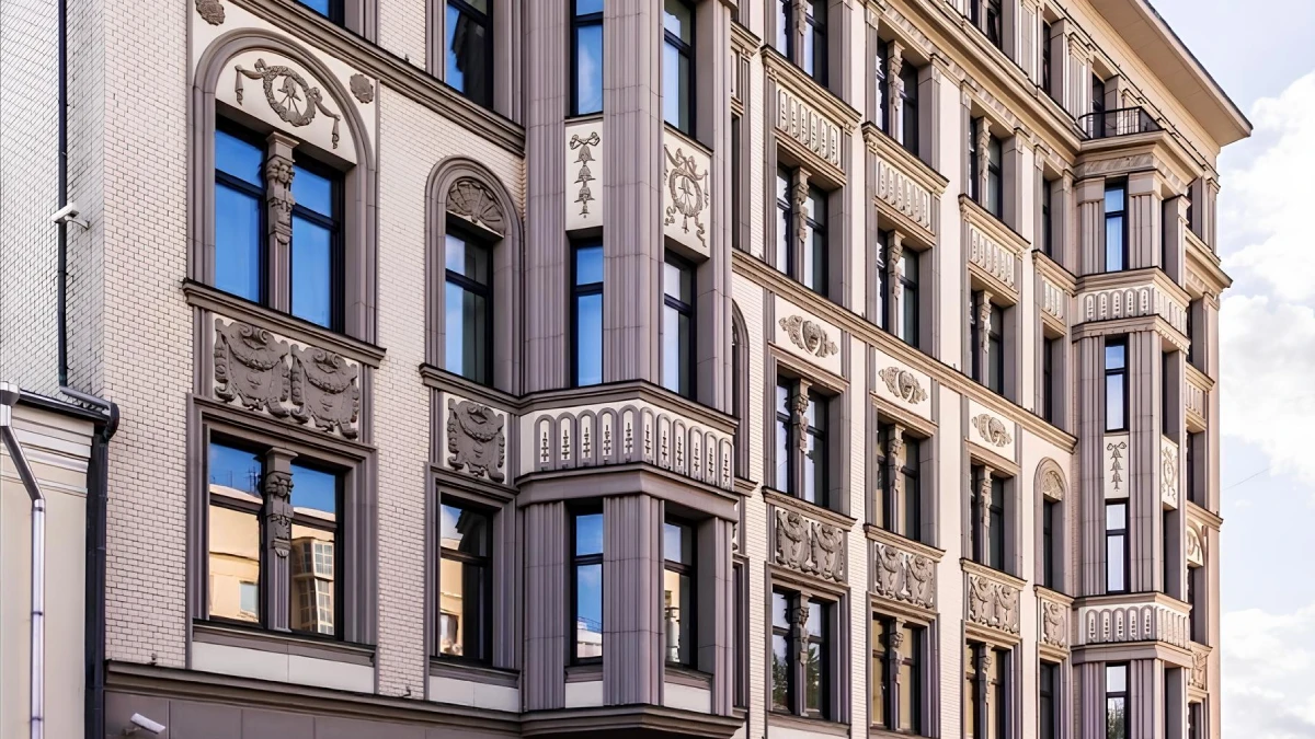 Воссозданы все ключевые элементы – фигурные эркеры, ажурные балконы, парадный фасад, обогащённый лепным декором. Задние и боковые фасады выполнены из мраморизованного кирпича с применением вентилируемых конструкций.
