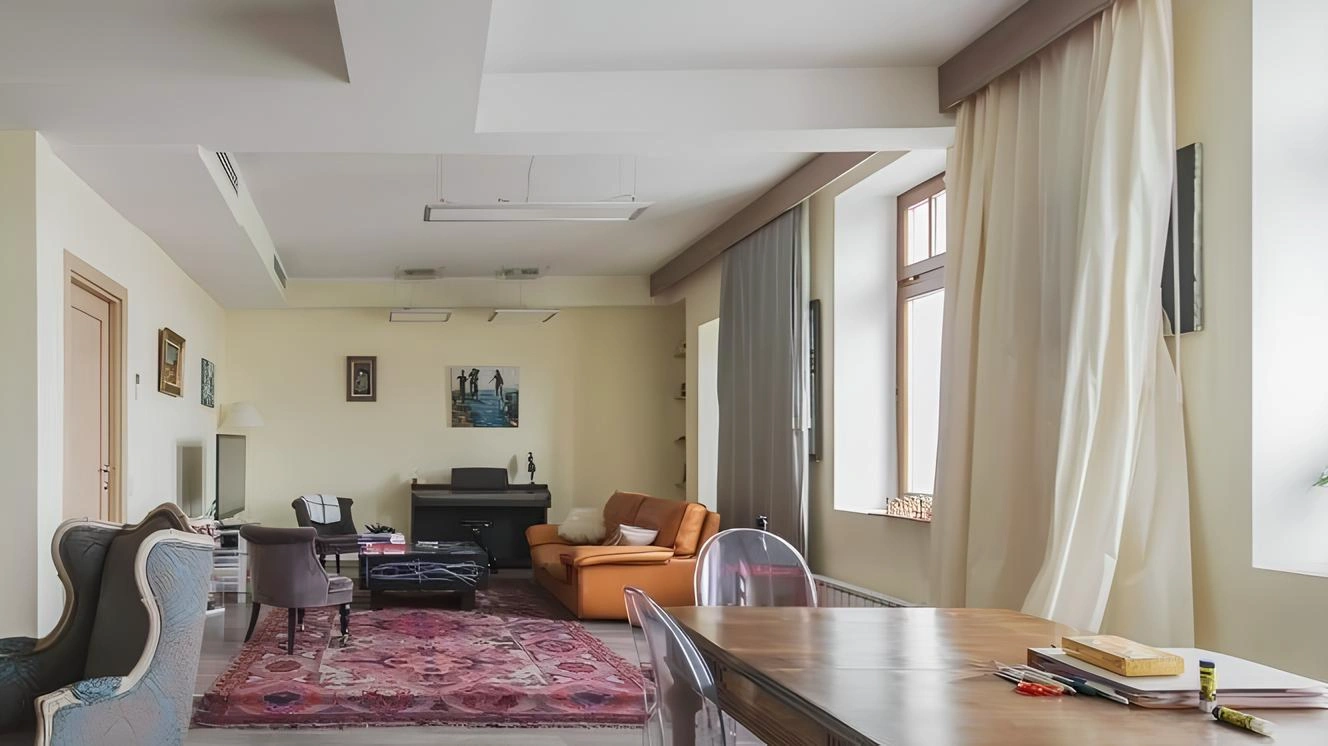 В ходе реконструкции были бережно восстановлены все архитектурные детали, включая оконные проемы характерной формы. Естественный свет проникает в помещения через большие окна, подчеркивая простор интерьеров. Сохранение подлинных элементов создает неповторимую атмосферу старинного московского особняка.