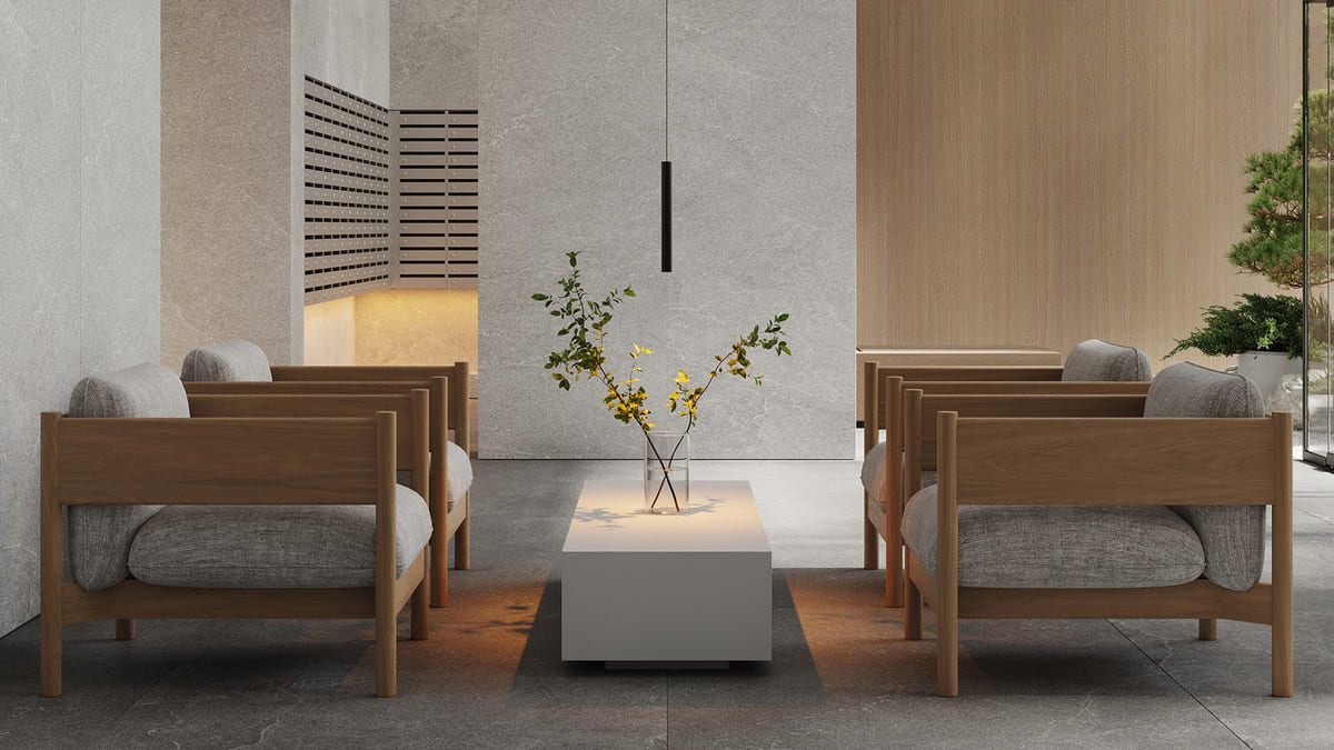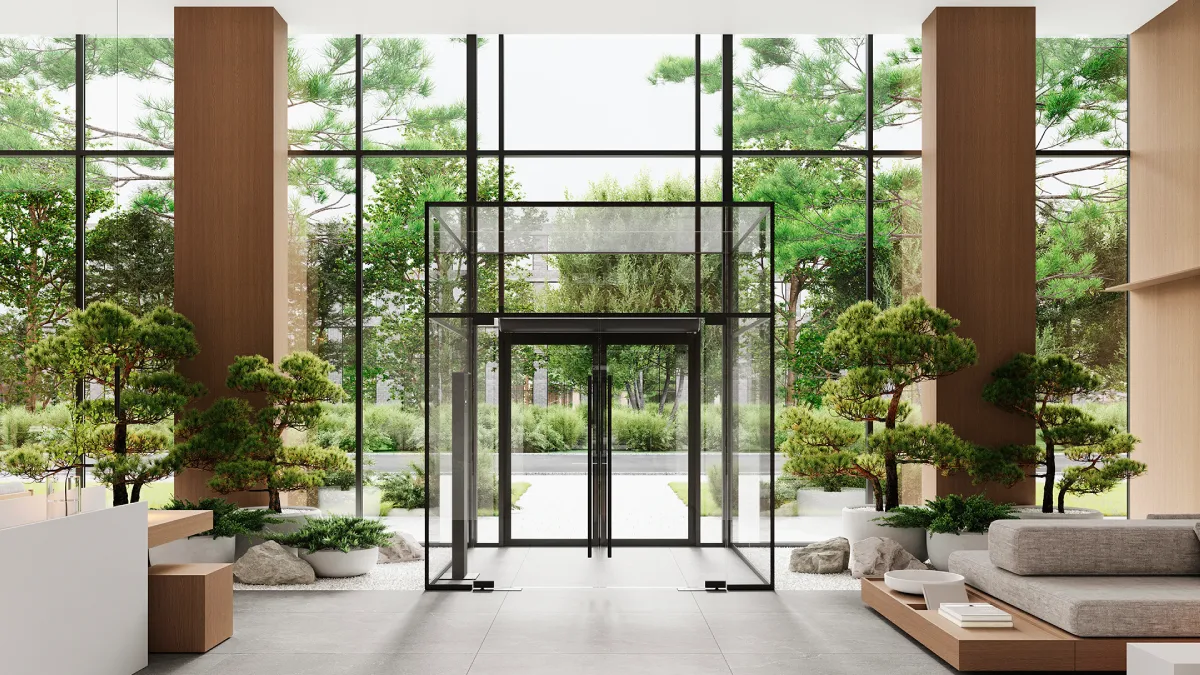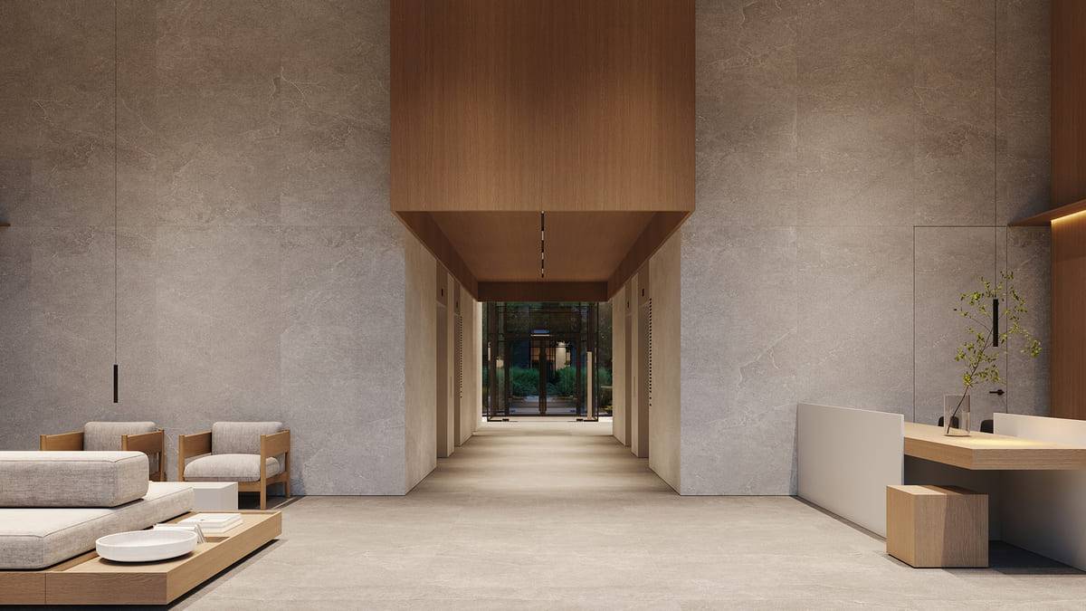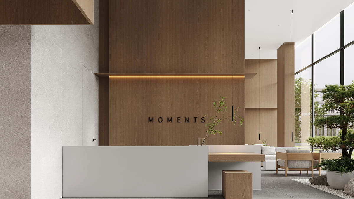 Лобби в Moments продуманы как продолжение садового пейзажа – панорамные окна открывают вид на зелёный двор, мягкие тона отделки создают атмосферу тишины.
