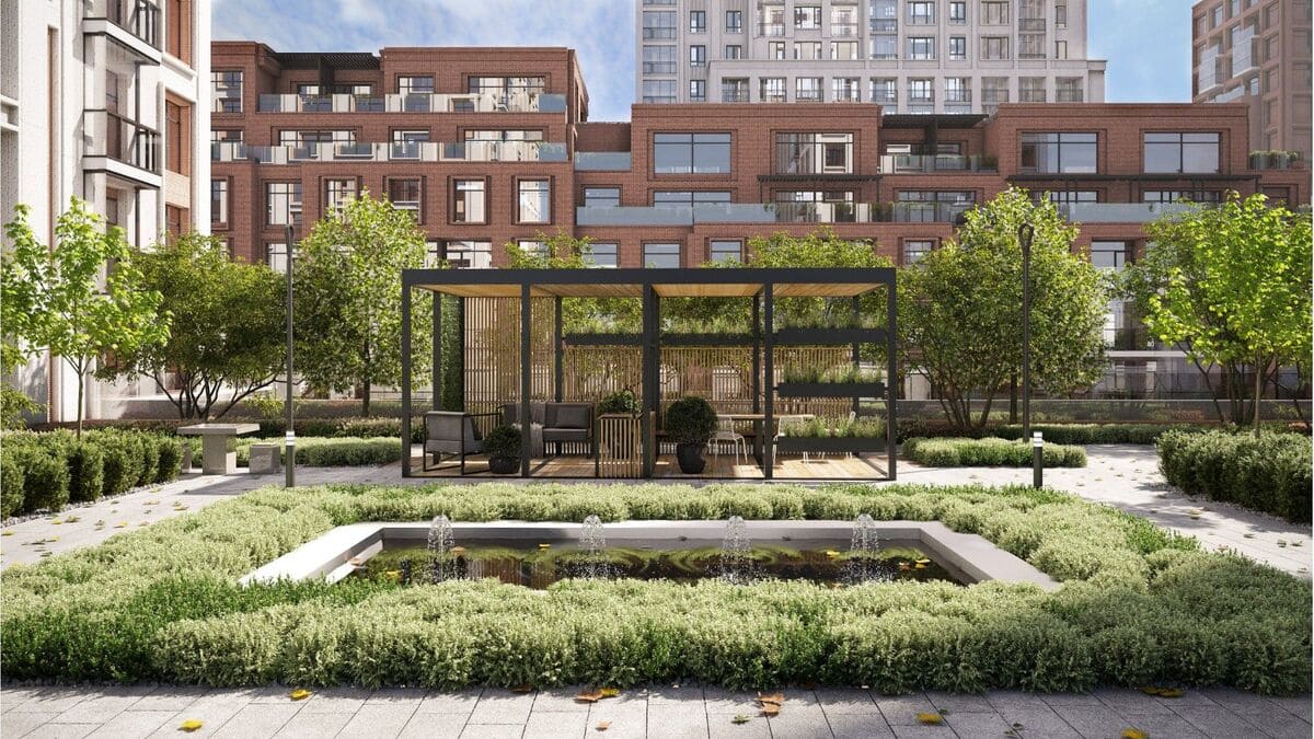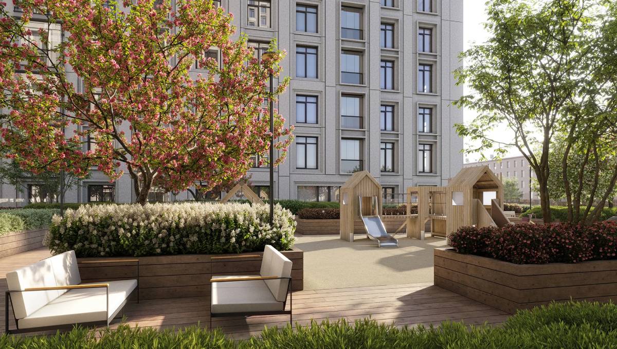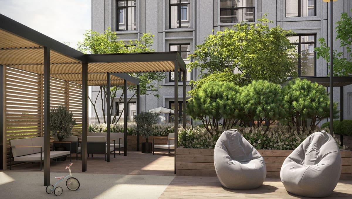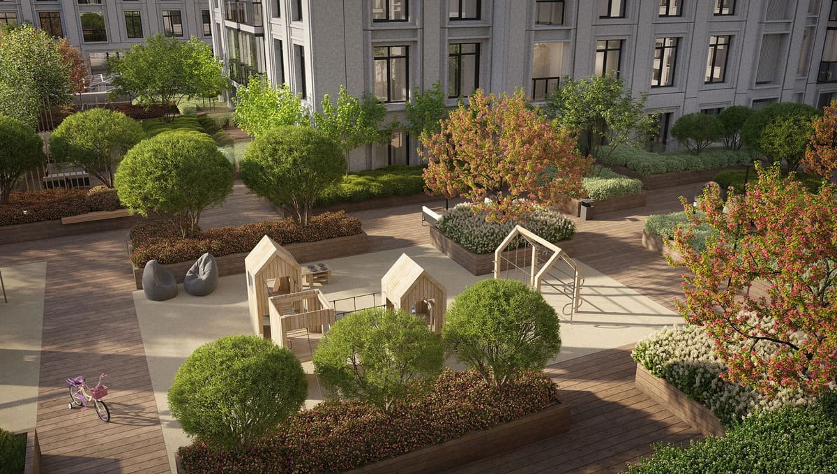 Дворовые пространства выполнены в стиле пэчворк – каждый участок уникален, с собственным характером. Камерные сады, ландшафтные композиции, детские и спортивные зоны, lounge-пространства формируют многоуровневую среду для жизни.