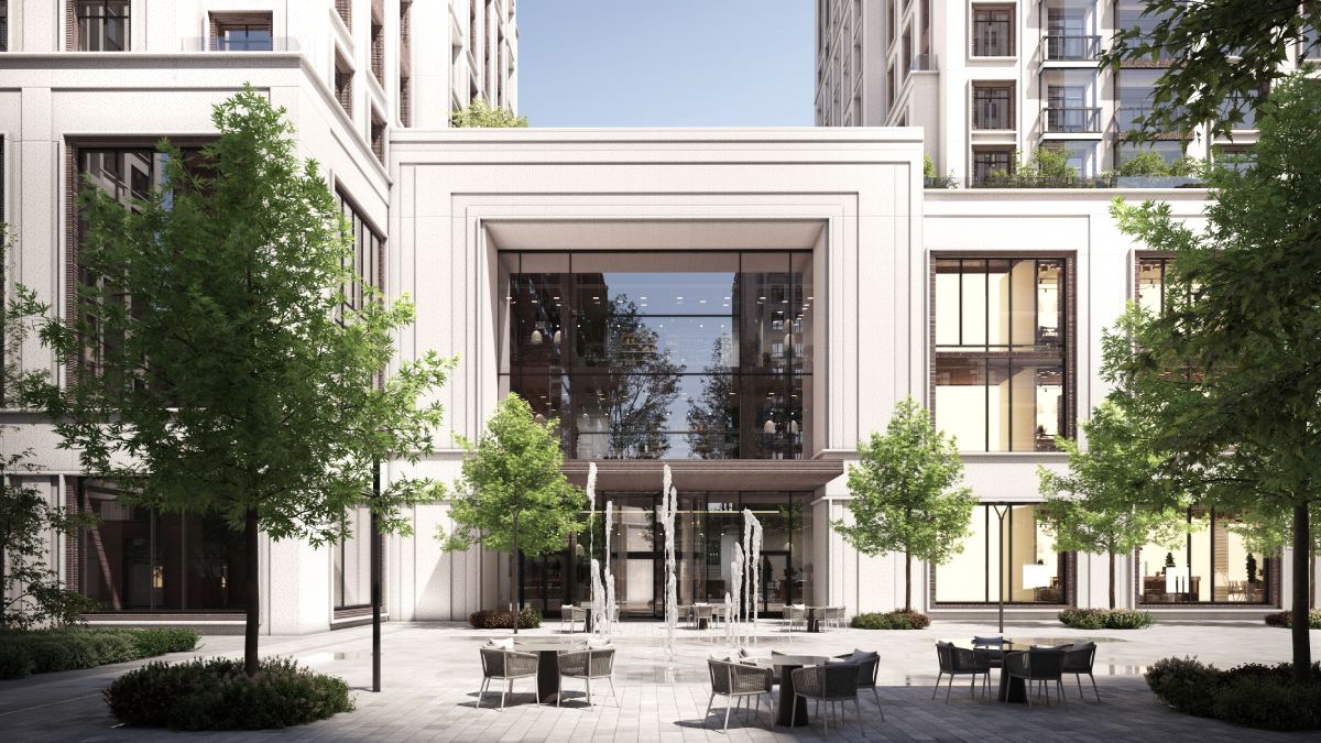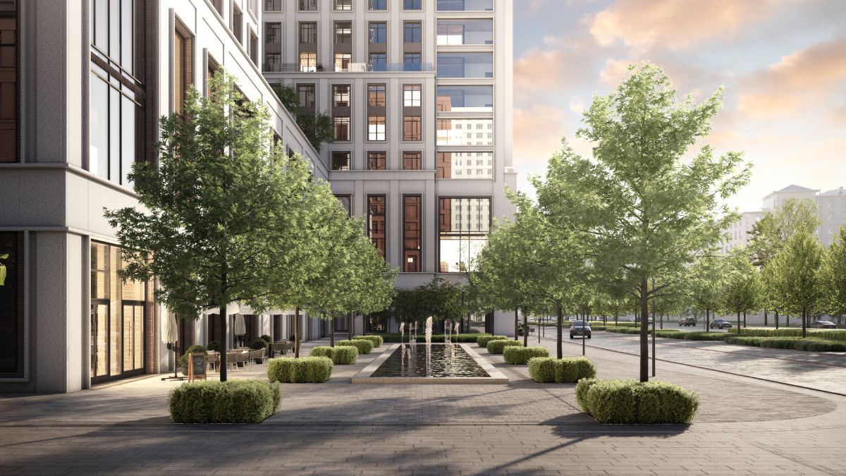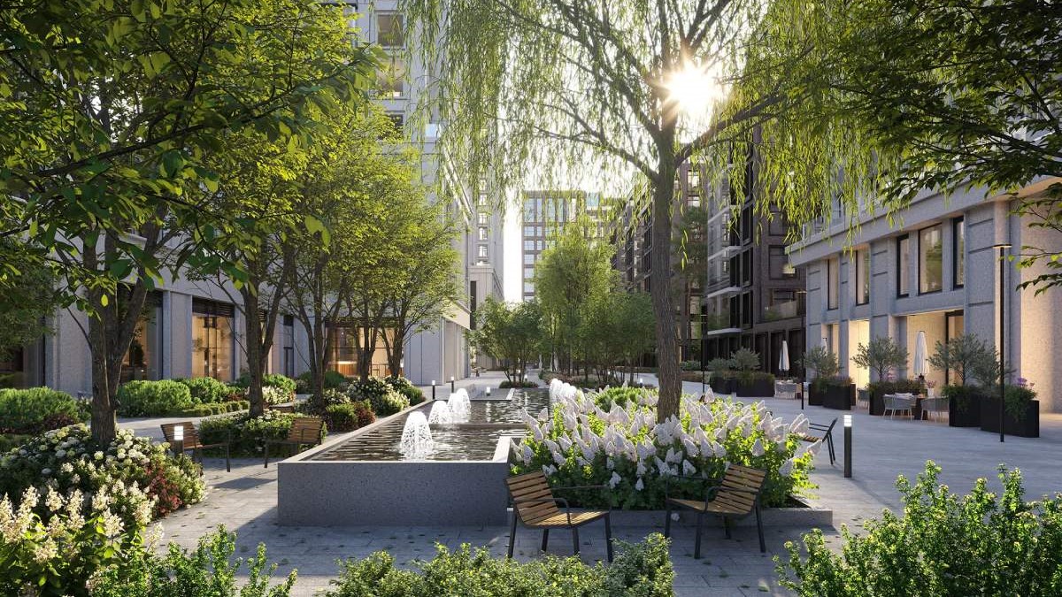 Проект создан по концепции «города в городе»: с уютными площадями, чередой бульваров, сквером, а также офисными и торговыми пространствами.