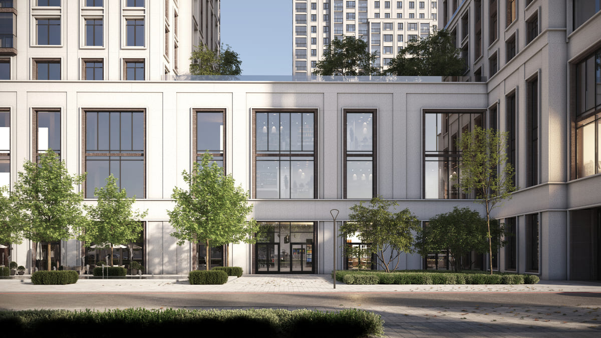 Променад станет активной городской улицей: здесь расположатся управляющая компания, консьерж-служба, медицинский пункт, соседский центр, мини-маркет, детский клуб и кофейни.