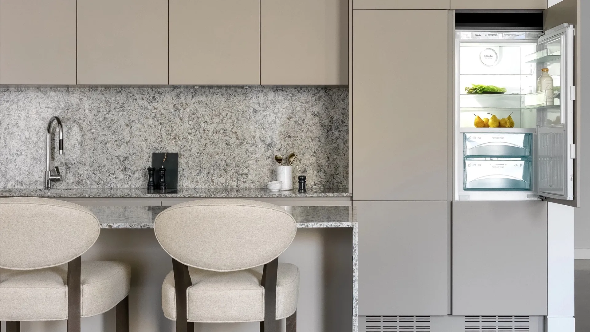Более 50% площади фасада занимает панорамное остекление, изготовленное по специальному заказу в Швейцарии. Окна разной формы и размера ритмично чередуются, создавая динамичную игру света и тени в течение всего дня. Такой подход создает ощущение легкости и наполняет интерьеры апартаментов естественным светом, стирая границу между внутренним пространством и улицей.