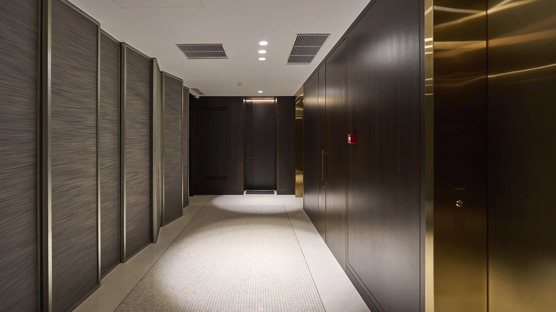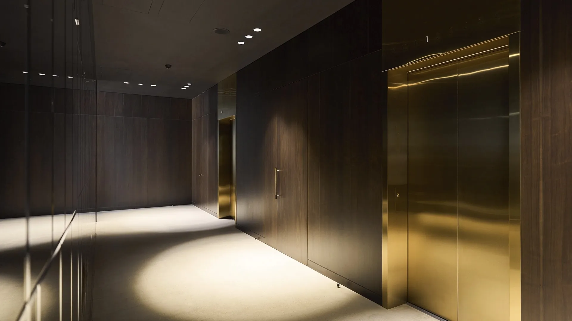 Многоуровневое освещение и высокие потолки создают ощущение простора и особого уюта, превращая лобби в продолжение личного пространства жильцов.