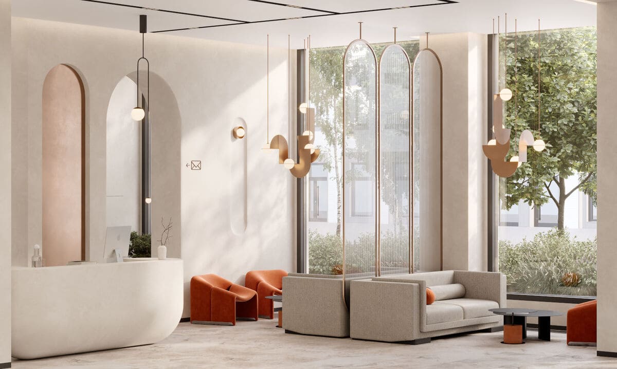 Входные группы выдержаны в архитектурной логике проекта – чёткая геометрия фасадов находит отражение в интерьере. Высокие потолки до 4 метров, витражные окна, светлая палитра и мягкие формы мебели создают спокойную атмосферу.