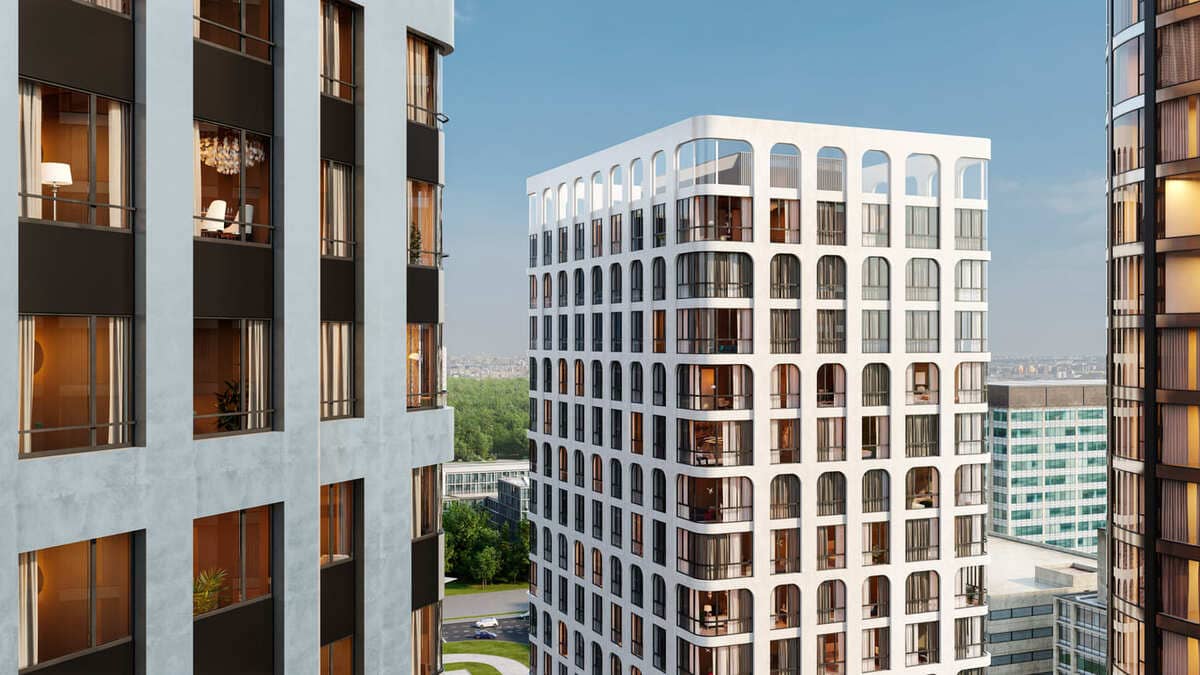 Архитектурная концепция разработана британским бюро AHR и основана на идее динамики, рельефа и лаконичности. Многоуровневая структура корпусов – от 5 до 35 этажей – создаёт вариативный силуэт, а строгая геометрия фасадов смягчается французскими окнами и витражным остеклением.