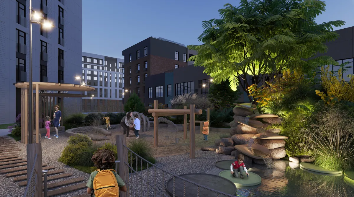Расположение у воды дало возможность создать ландшафтную концепцию, основанную на образах природы. Каждый двор здесь тематический: где-то используется мотив вулкана, где-то скрытого сада.