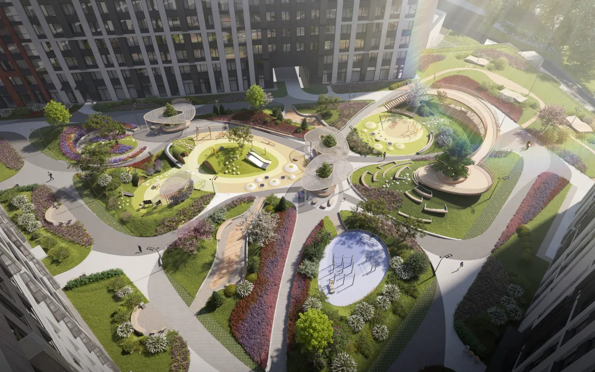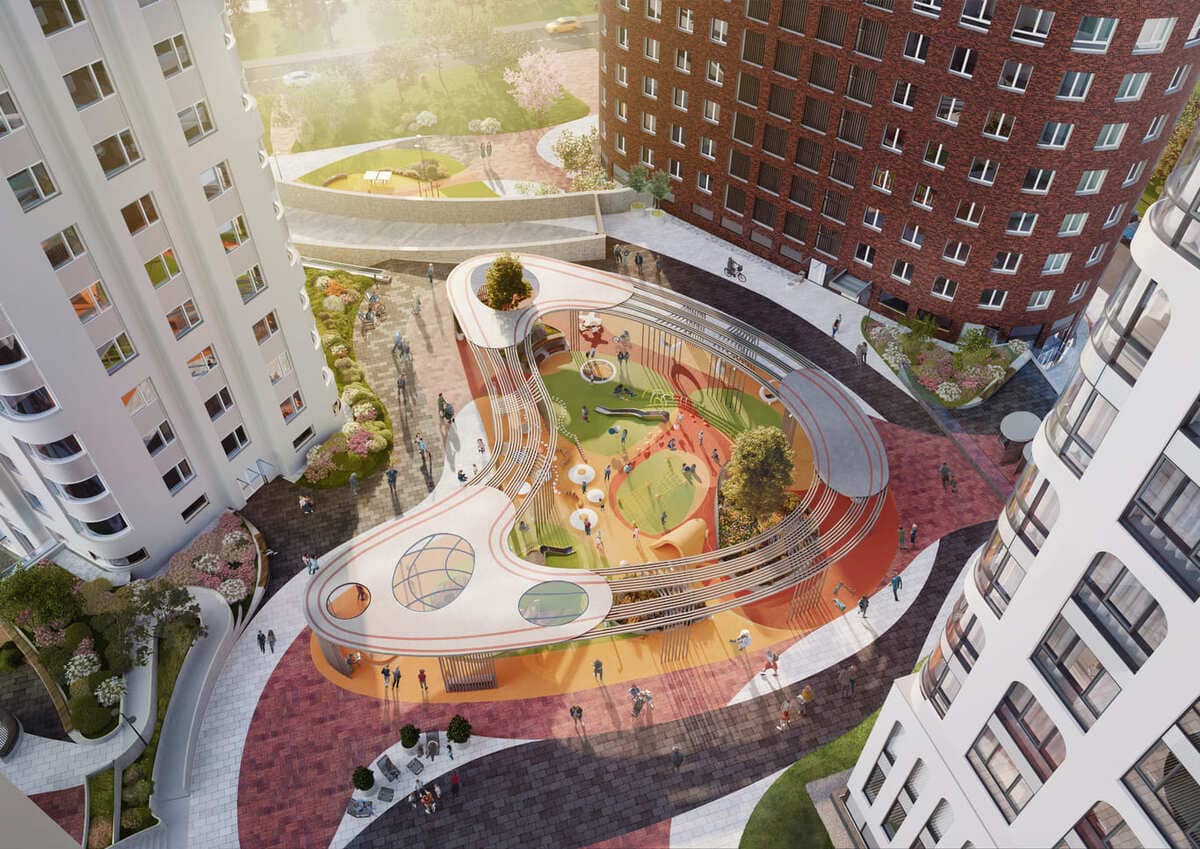 Архитекторы создали маршруты и зоны, которые не повторяются, но объединены общим ощущением – уюта, сценарности, текучести. Пространства дополняются теневыми навесами, зонами отдыха, игровыми площадками и бульваром, который связывает дворы с набережной.