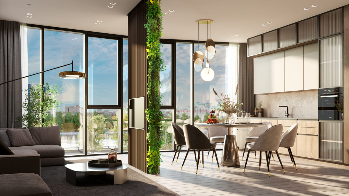 Панорамное остекление, угловые окна, свет во всю стену делают пространство визуально шире, наполняют его воздухом и лёгкостью. Некоторые квартиры выходят на приватные террасы, превращая идею уюта в продолжение контакта с природой.