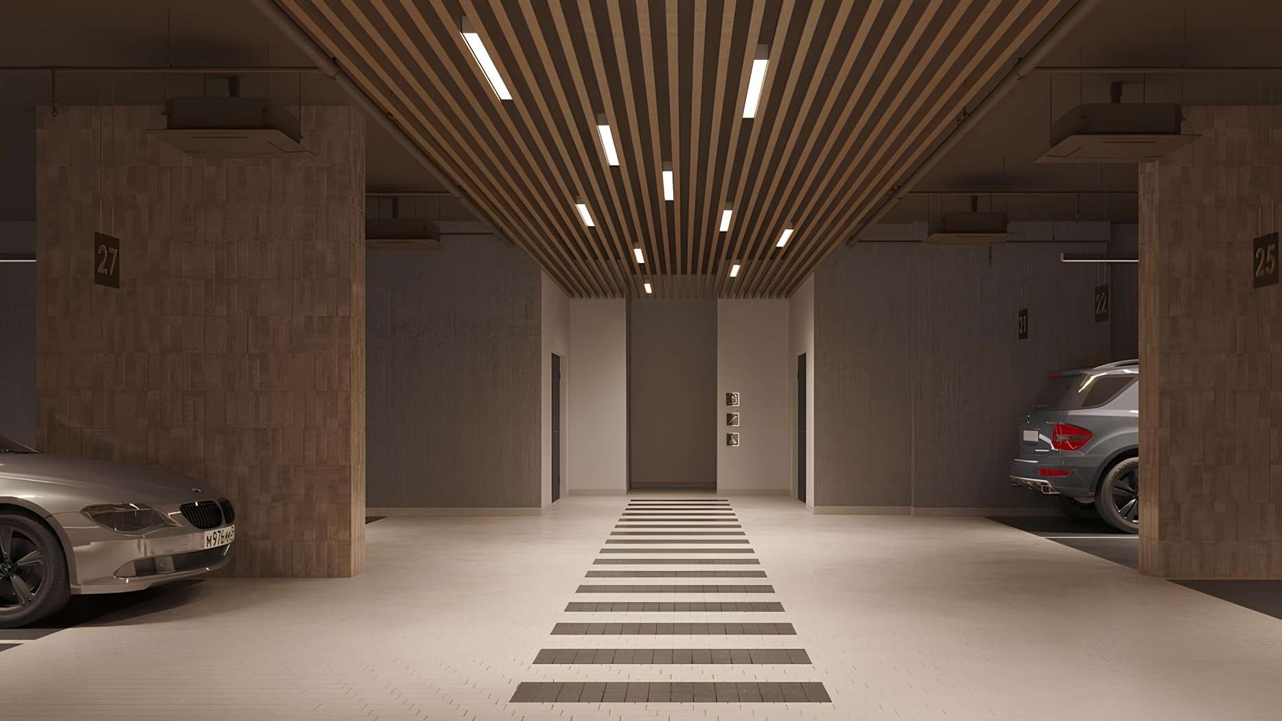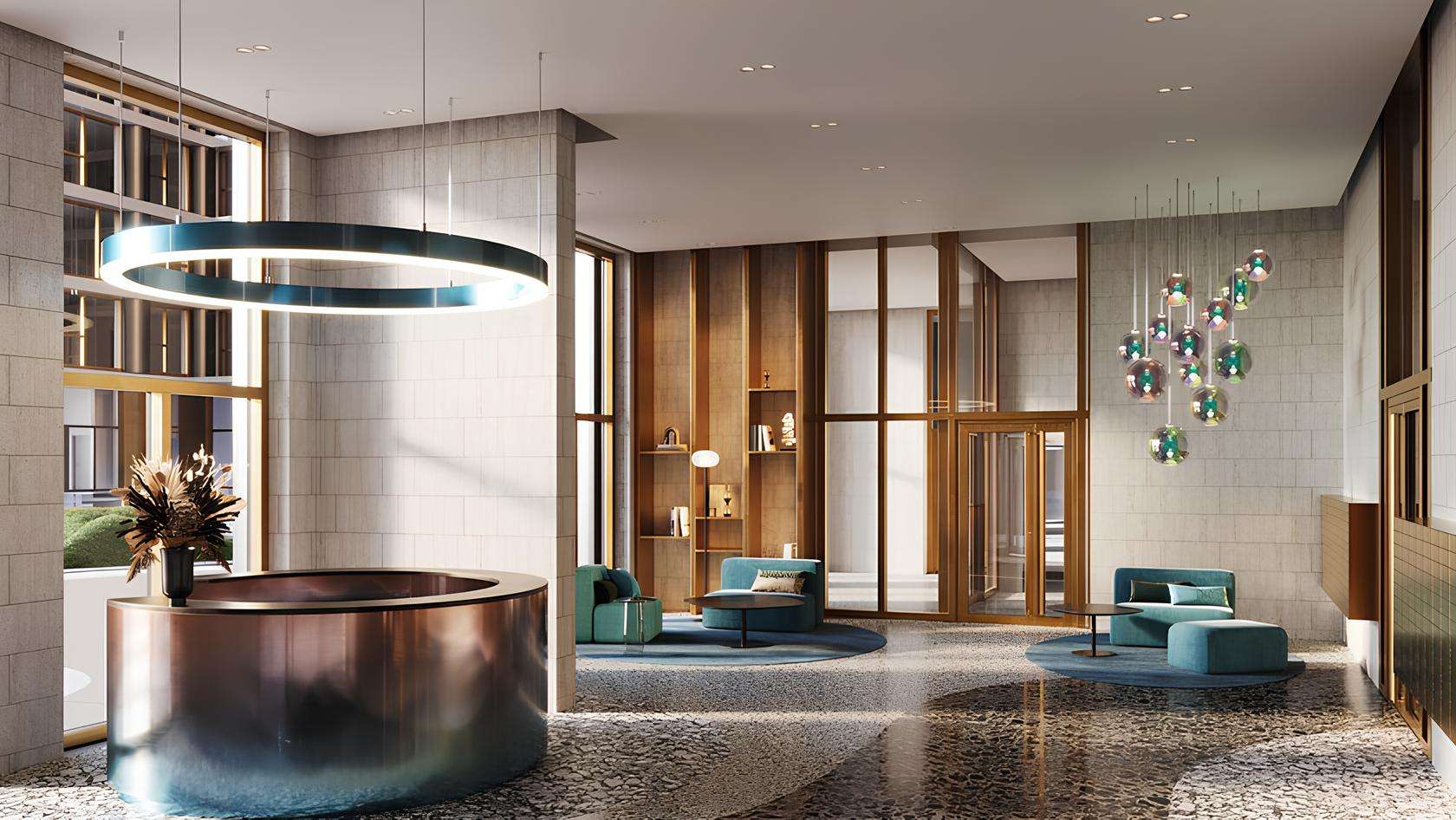 Интерьеры оформлены в стиле минимализма с элементами арт-деко, с использованием натуральных материалов — мрамора, дерева и латуни. Здесь обустроены уютные лаунж-зоны для отдыха и ожидания, а также комнаты матери и ребенка. Круглосуточная консьерж-служба встречает жителей и гостей, обеспечивая высокий уровень сервиса и безопасности.