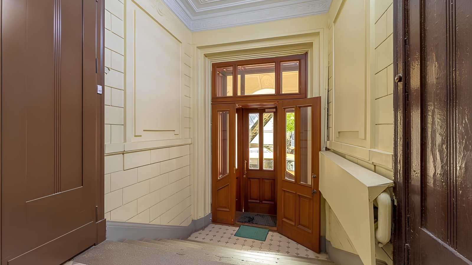 Входная группа жилого комплекса оформлена как просторное лобби с высокими потолками, создающее ощущение парадности и простора.