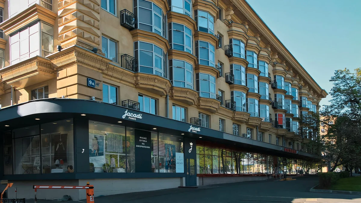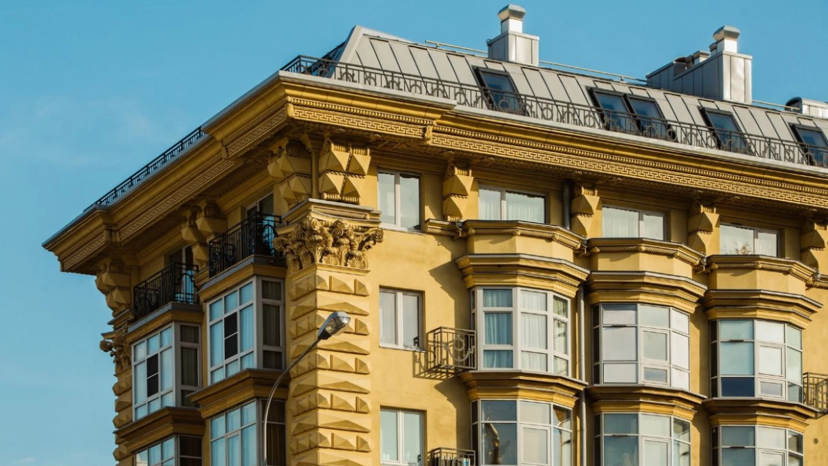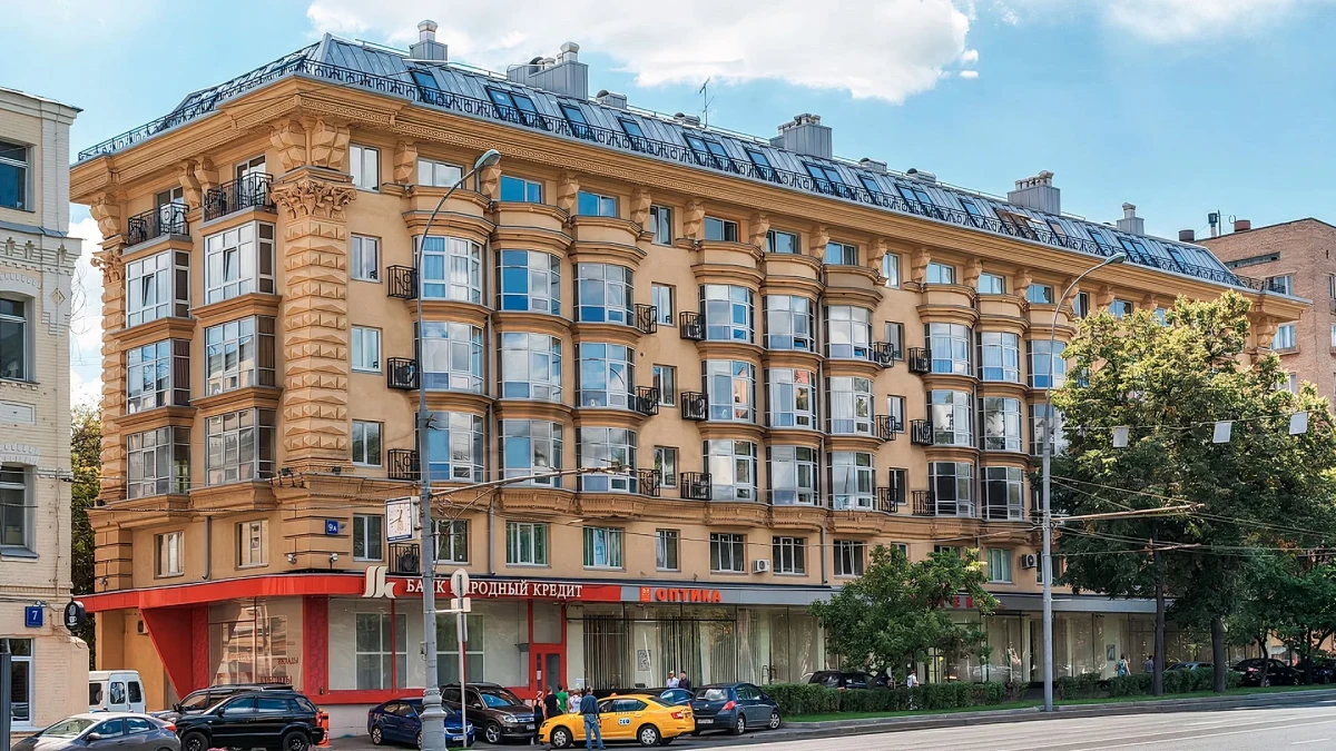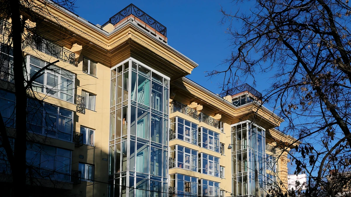 Здание выполнено в классическом стиле с эркерами, колоннами и лепниной. Авторский проект включает три шестиэтажные секции, гармонично вписывающиеся в историческую застройку района. Фасады украшают декоративные элементы и панорамное остекление, подчеркивающее статус всего комплекса.