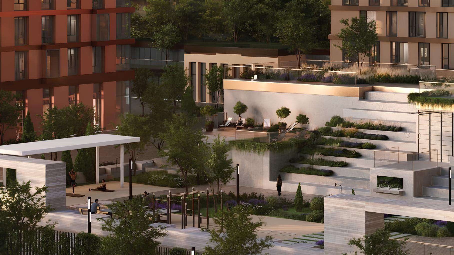В озеленённом пространстве продуманы пешеходные аллеи, пространства для отдыха и общения и игровые зоны. Архитекторы создали уютные переулки, ведущие к подъездам, и открытые общественные пространства, объединяющие жителей.