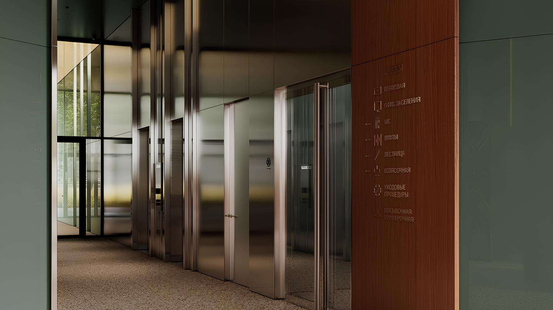 Входные группы и лобби каждого корпуса выполнены по авторской интерьерной концепции бюро Babayants Architects. Пространства встречают жителей высокими потолками, дизайнерской отделкой и тёплой цветовой гаммой с использованием натуральных материалов.