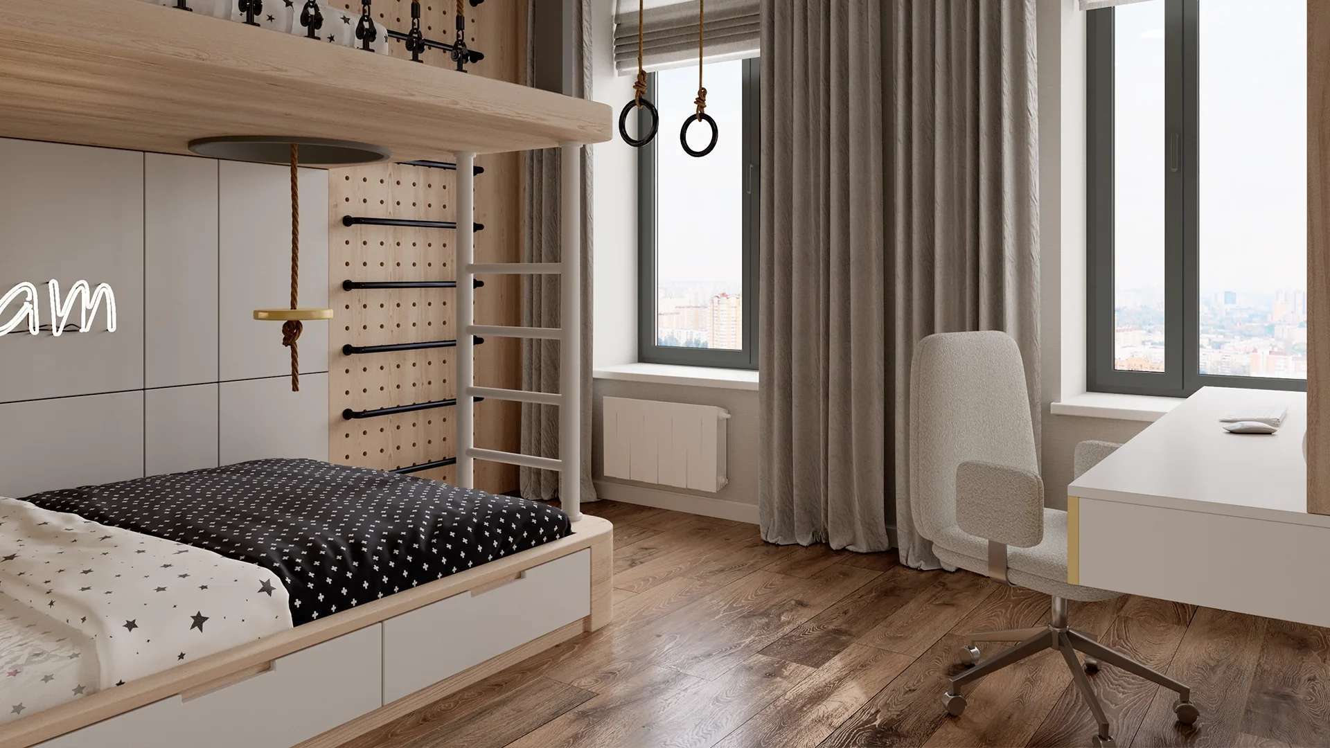 Территория ЖК «Обручева 30» представляет собой закрытый от машин и посторонних двор, спроектированный как безопасное и комфортное продолжение дома. Здесь гармонично сочетаются зоны для отдыха всех возрастов: современные детские площадки, спортивные зоны с тренажерами и тихие уголки со скамейками для спокойного отдыха. На скамьях даже встроены розетки для зарядки гаджетов, что подчеркивает продуманность каждой детали.