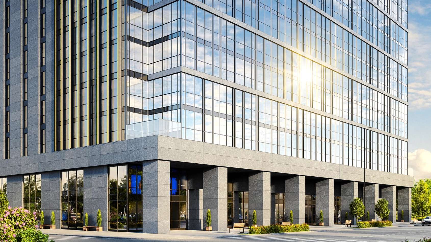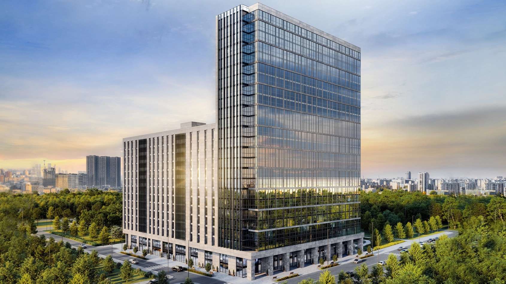 Архитектурная концепция комплекса отражает современный подход к городскому строительству, соединяя эстетику и функциональность. Фасады выполнены в минималистичном стиле с применением панорамного витражного остекления и алюминиевых ламелей, что придает зданию визуальную лёгкость и современный облик.