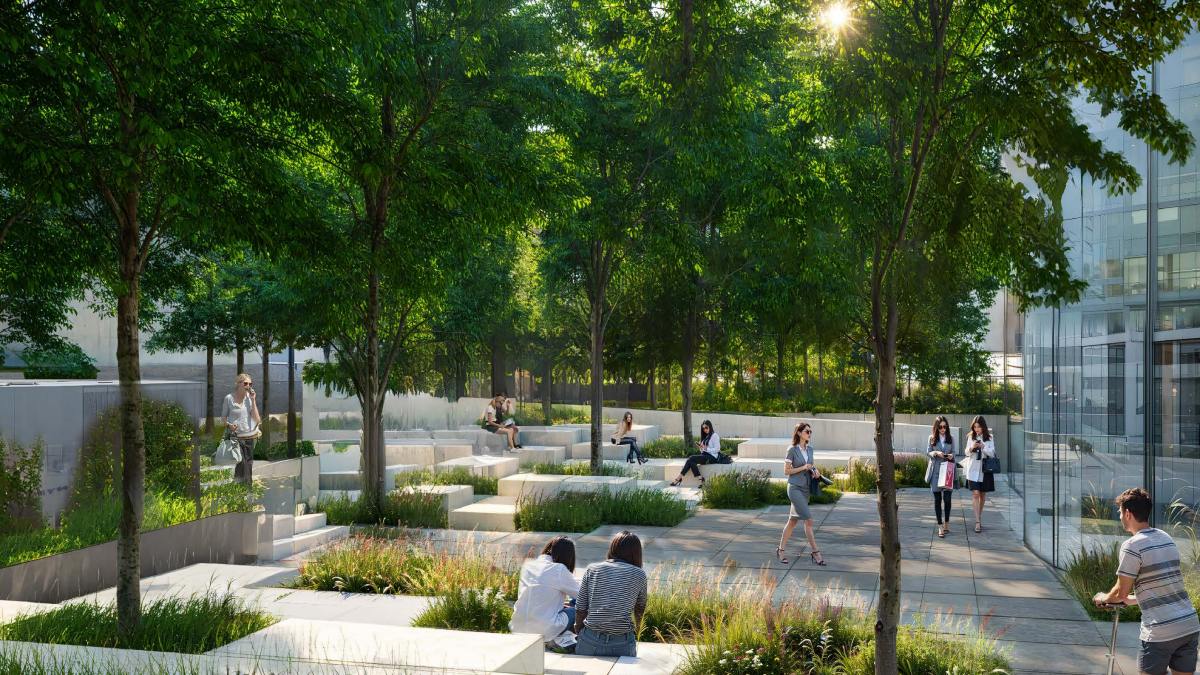 Ландшафтный дизайн включает озеленённые участки, тенистые аллеи, открытые lounge-зоны и зоны для работы на свежем воздухе.