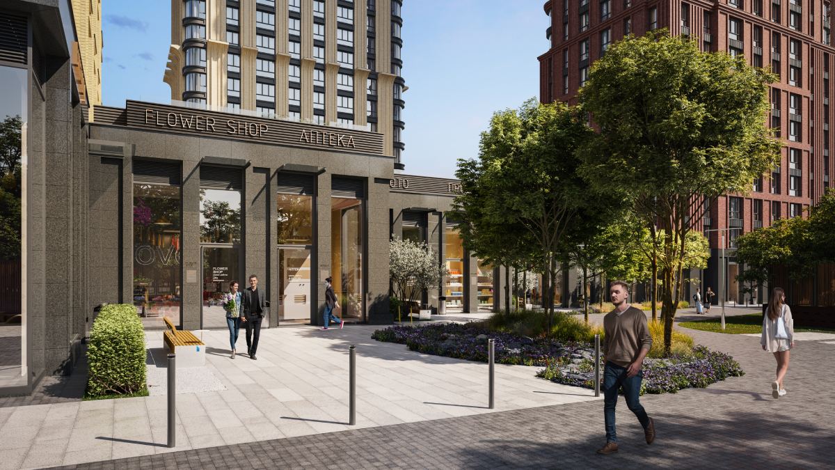 Вся территория – 4,6 гектара – пронизана зелёными аллеями и многоярусным озеленением, формирующим живую и комфортную среду для жителей.