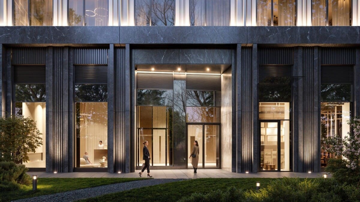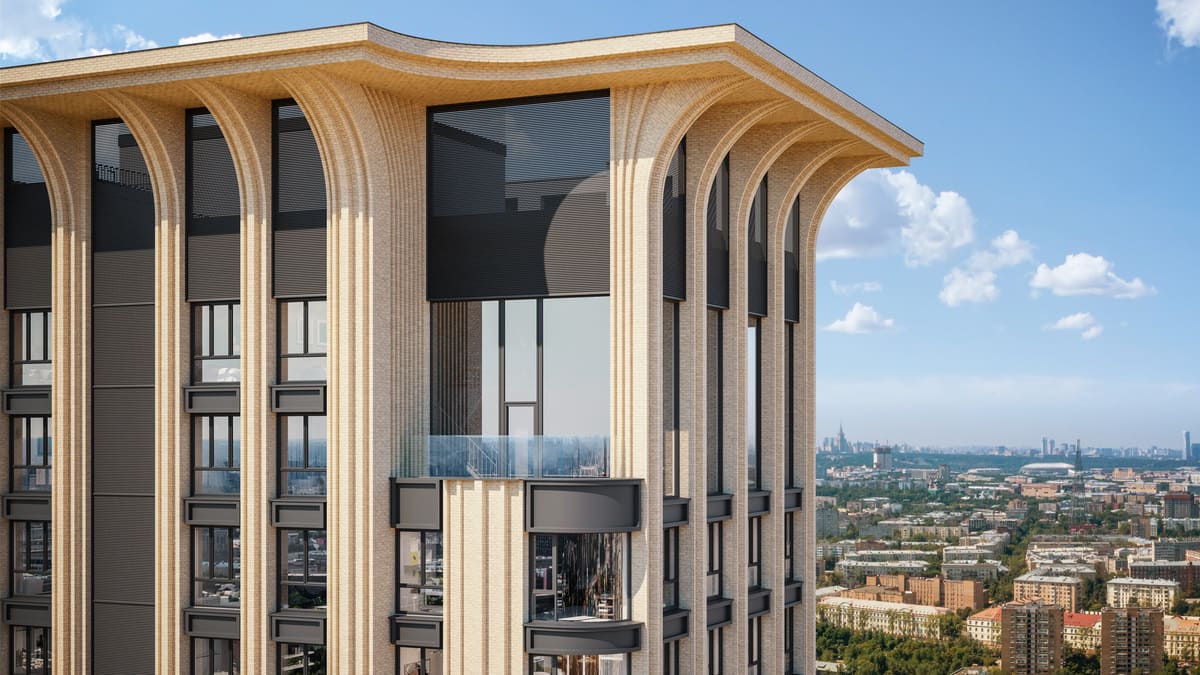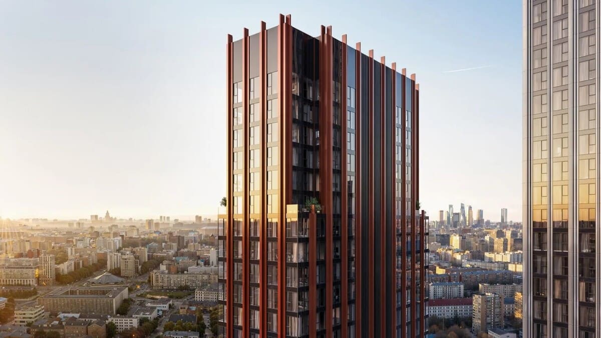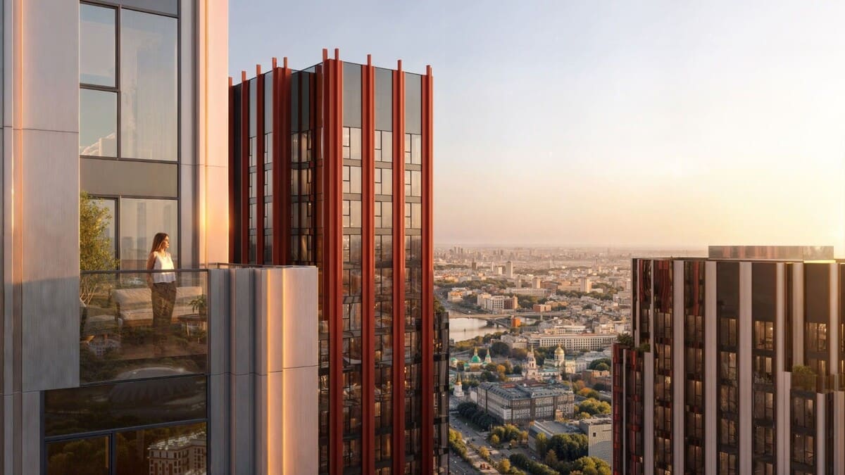 Панорамные башни имеют разную высоту и оформлены в эстетике арт-деко: чёткие геометрические формы, благородные материалы и декоративные детали.