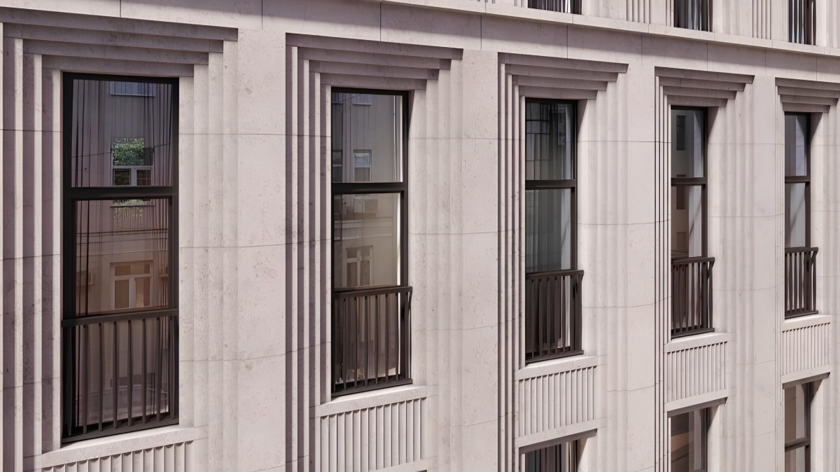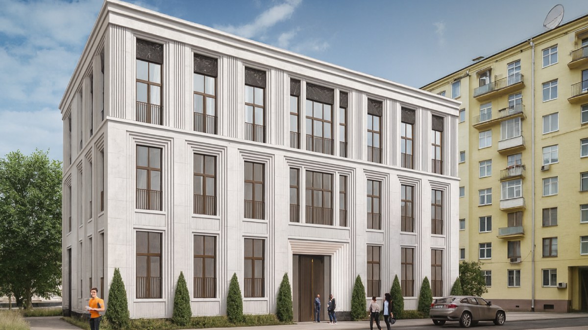 Вертикальные рифления и монументальный карниз создают гармонию с историческим окружением Патриарших прудов.