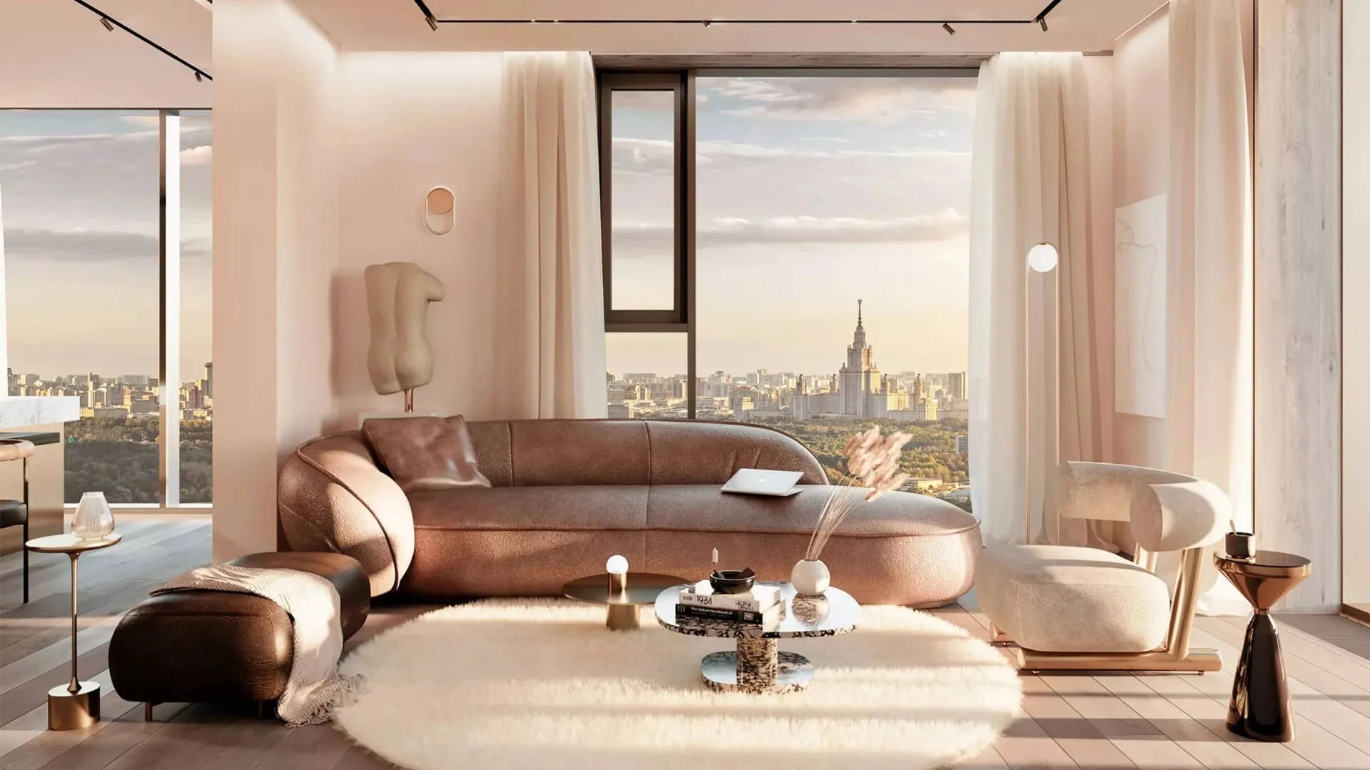 Во всех апартаментах установлены панорамные окна, наполняющие пространства светом и открывающие виды на город. Для будущих жителей доступны три варианта дизайнерской отделки на выбор: «Модерн», «Индустриальный» и «Вне времени».