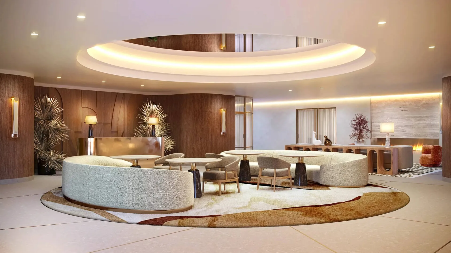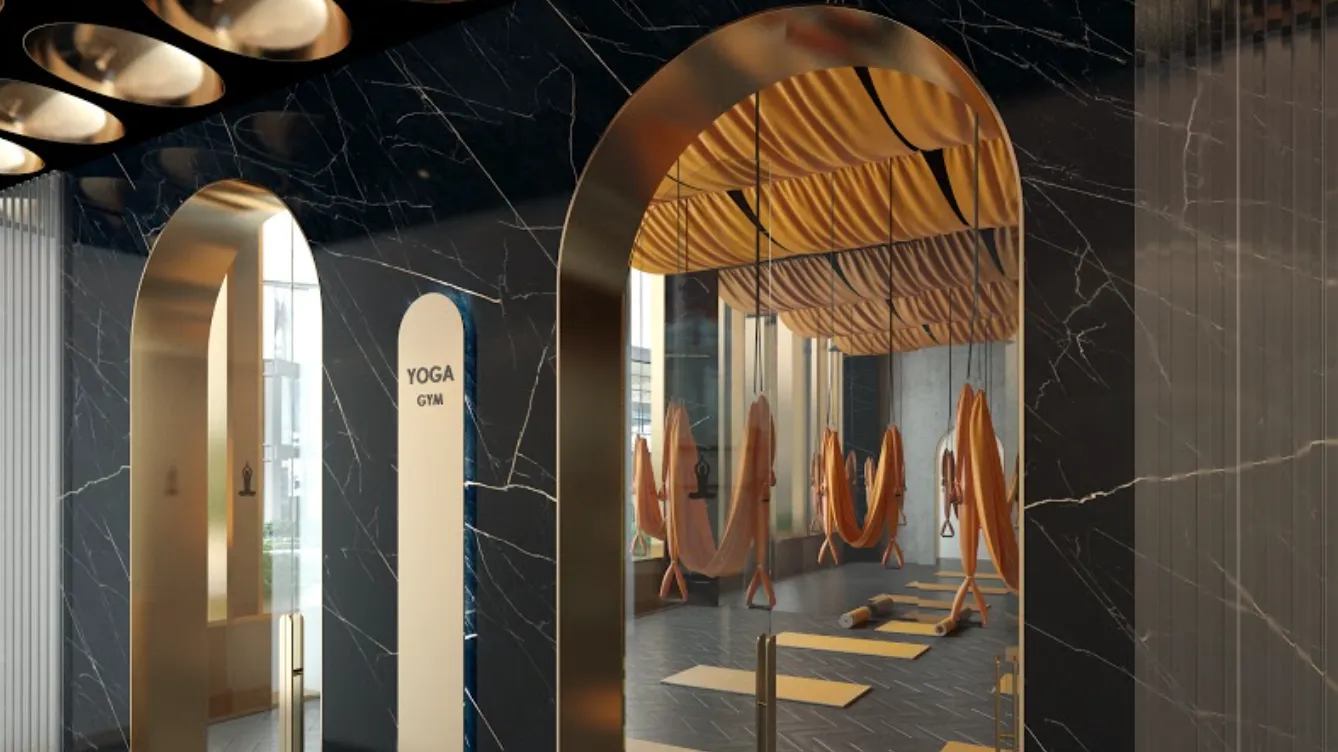 Ключевой темой, вдохновившей дизайнеров, стало современное переосмысление русского фольклора и культурного наследия. В лобби вы увидите сияющую латунь, мраморные полы и элементы из теплого бархата. Центральным элементом пространства является впечатляющая своими размерами лестница. Помимо парадного лобби, в комплексе также предусмотрены уютные лаунж-зоны для отдыха и работы.