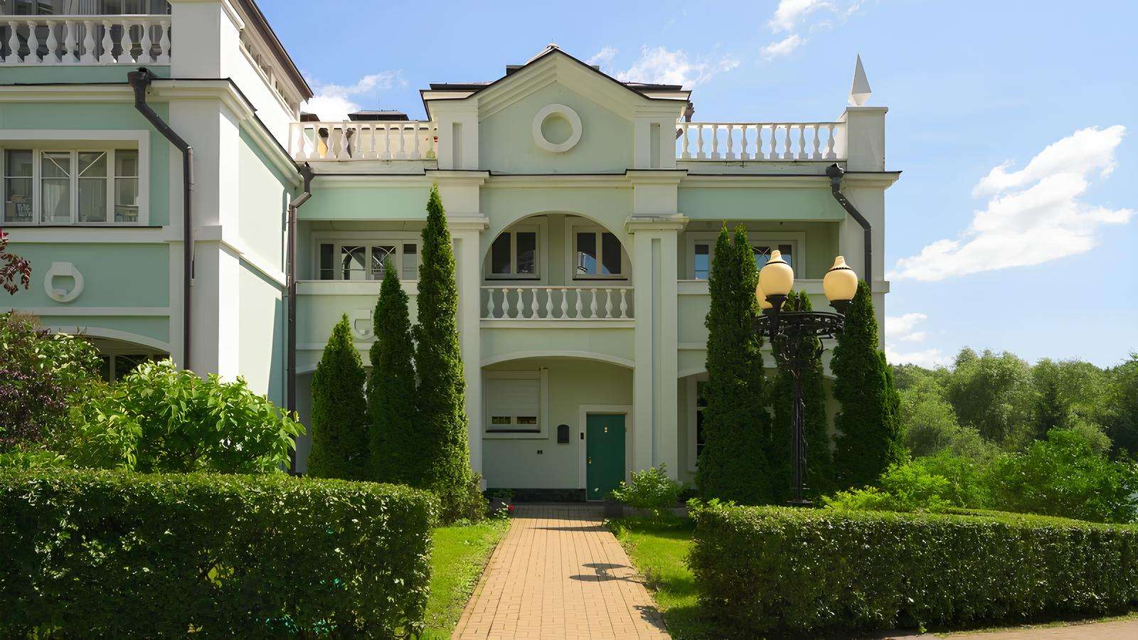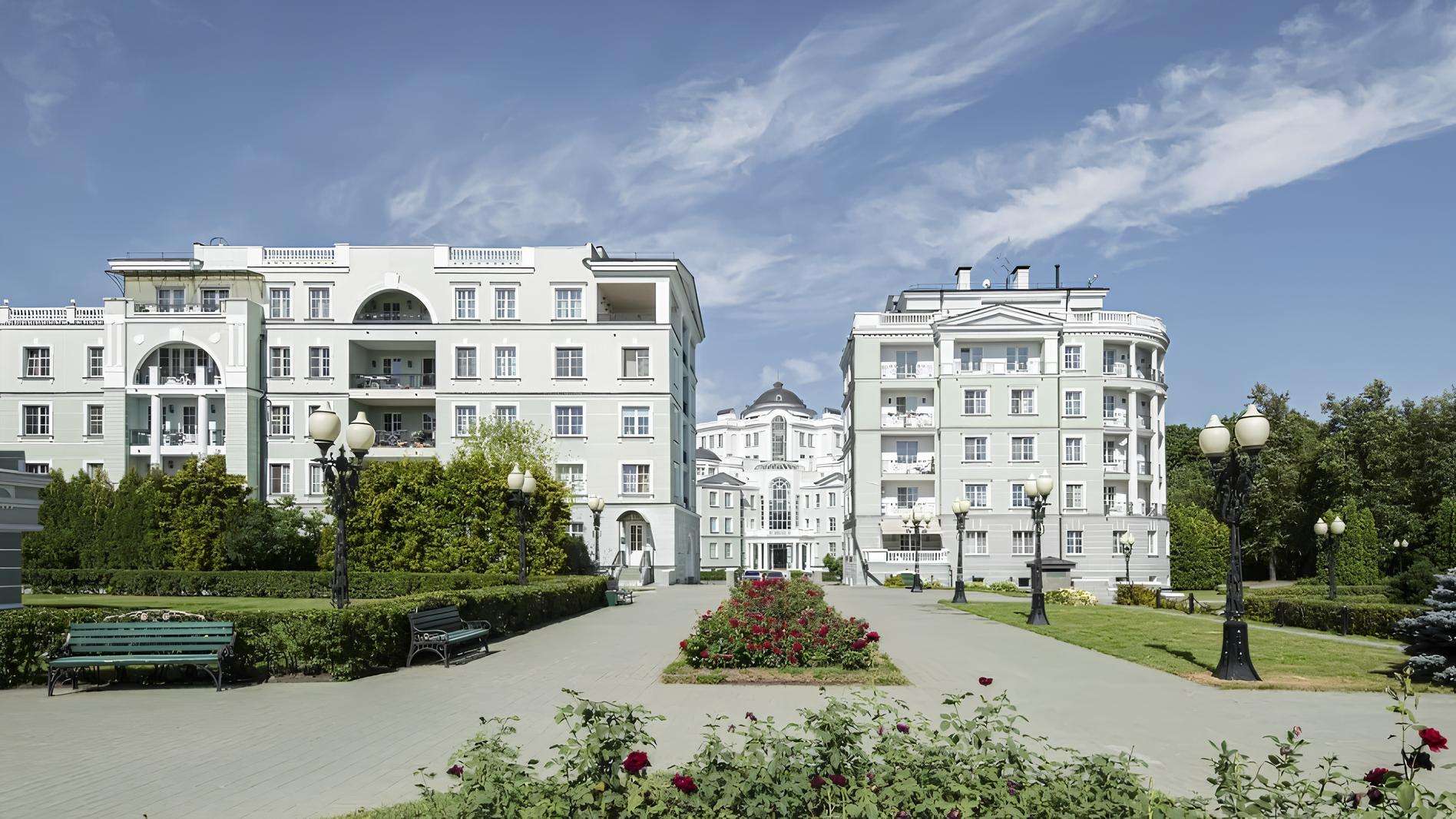Архитектурная концепция комплекса вдохновлена образами русских дворянских усадеб XIX века, что гармонично вписывает его в исторический ландшафт местности. Фасады зданий, выполненные в светлых тонах, украшены классическими элементами: лепниной, колоннами, арочными проемами и изящными балконами с балюстрадами. Для отделки использованы дорогие материалы, включая мрамор и элементы художественной росписи, подчеркивающие статус объекта.