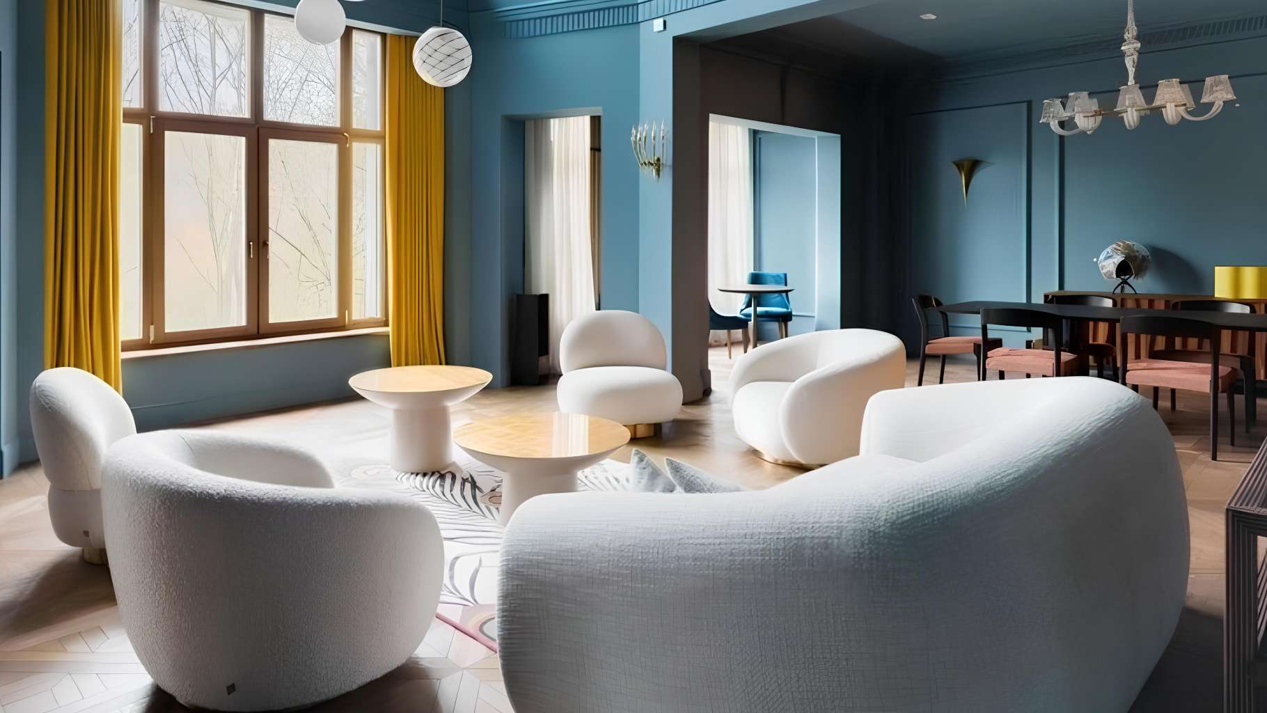 Зоны ожидания и лаунж-области обставлены комфортной мягкой мебелью, предлагая жителям и гостям удобное место для встреч. Дизайн дополнен живыми растениями и тщательно подобранным декором, который усиливает впечатление утонченности и внимания к деталям.
