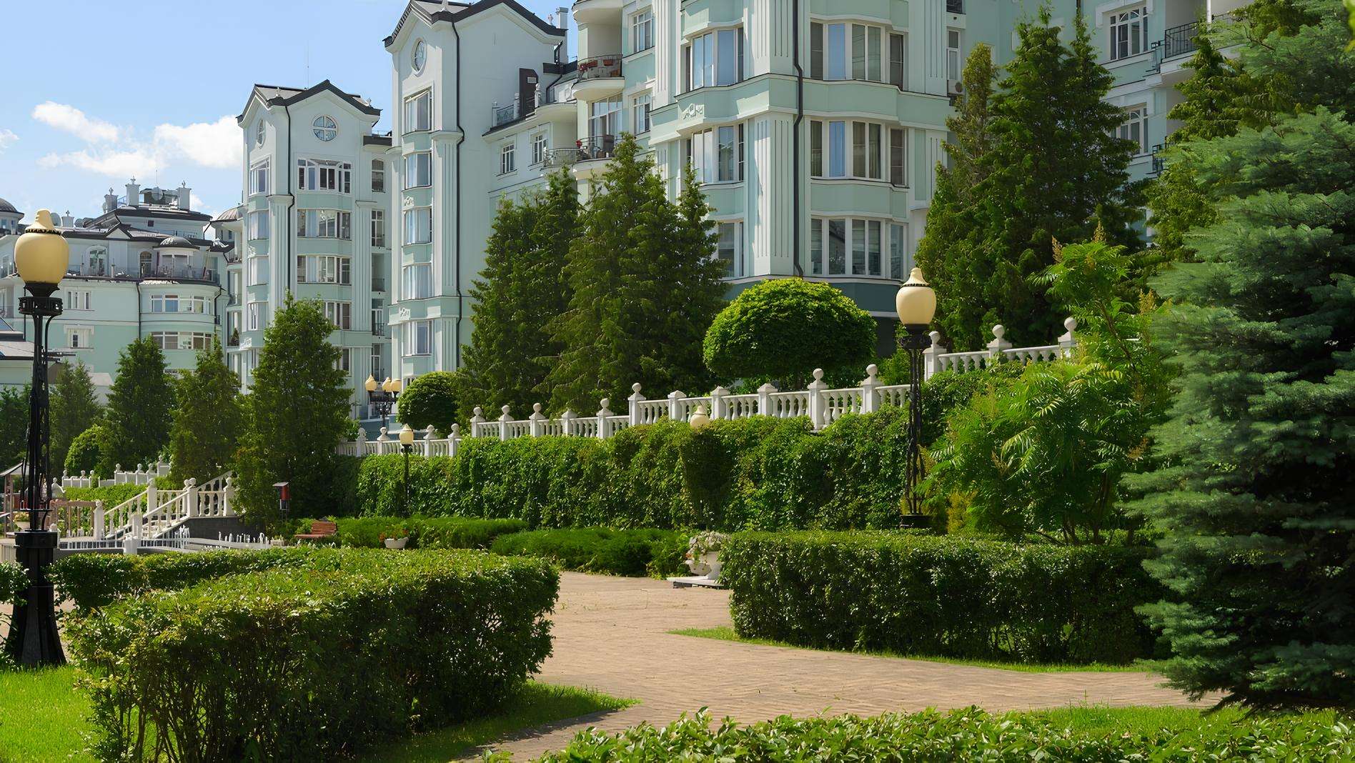 Территория комплекса представляет собой масштабный ландшафтный парк площадью 6,5 гектаров, спроектированный в духе классических русских усадеб. Здесь проложены прогулочные аллеи, установлены скамейки и декоративные фонари, а центральным элементом ландшафта выступает площадь с живописными фонтанами.
