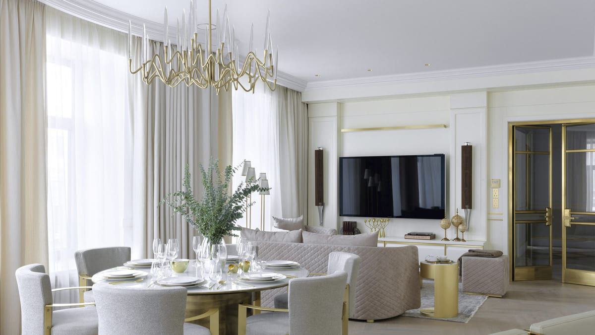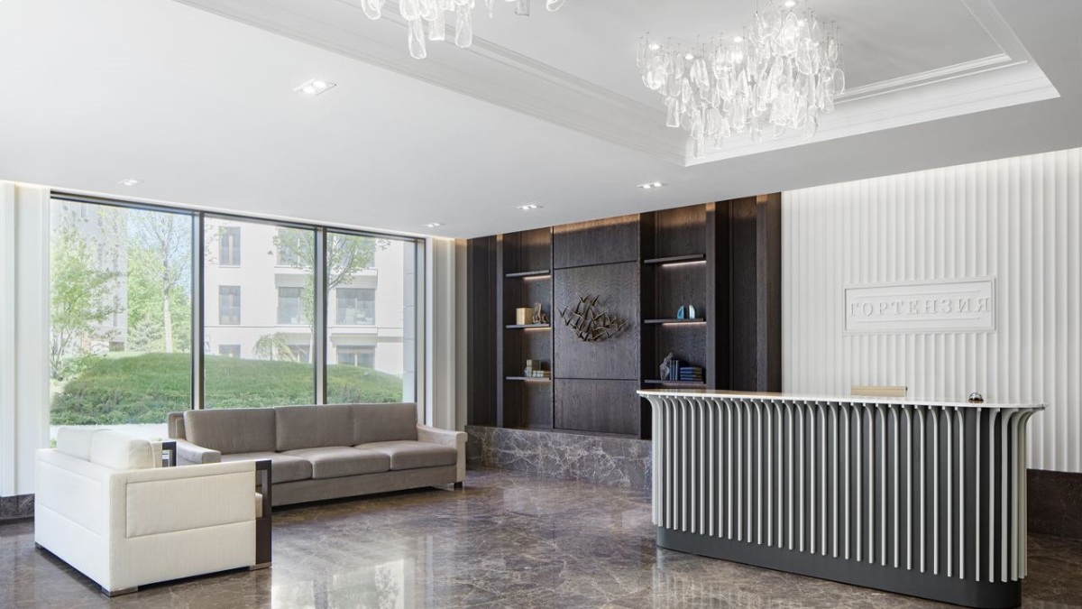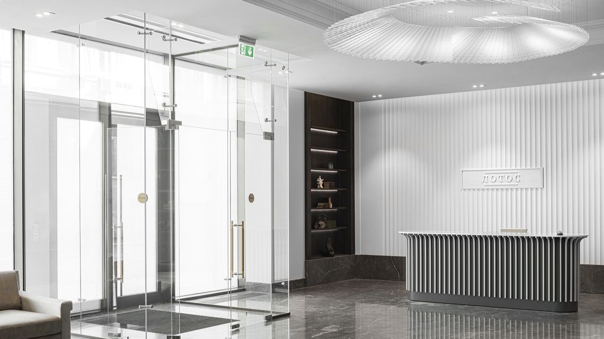 В отделке использованы премиальные материалы: натуральный камень, дерево, кожа и шёлк, создающие ощущение утончённой элегантности. Пространство наполнено светом и теплом, что подчёркивают мягкие зоны отдыха и стильная стойка ресепшена.