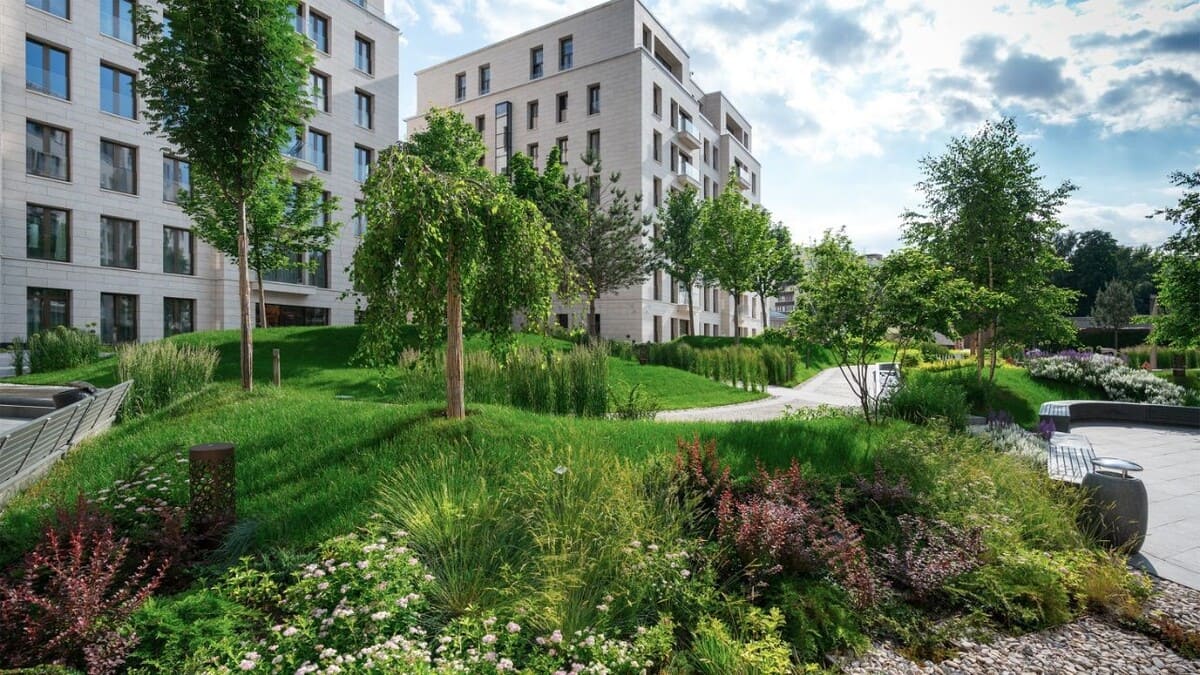 Жителей встречает английский сад с прогулочными аллеями, детскими площадками, сухим фонтаном и уютными lounge-зонами.